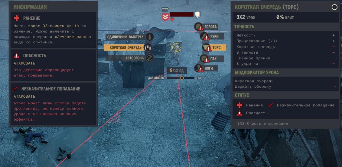Используйте прицеливание (ПКМ при выборе врага), которое увеличит точность стрельбы за счёт увеличения расхода ОД, и следите за подсказками. Небольшая полоска дальности оружия с перекрестием показывает, подходит ли ваше оружие для данной дистанции. Также прислушивайтесь и к фразам ваших наёмников перед тем, как выстрелить. Предупреждающие символы, такие как стена или броня, говорят о том, что выбранная часть тела находится за укрытием или бронирована. В таком случае, лучше выбрать другую часть тела или цель.