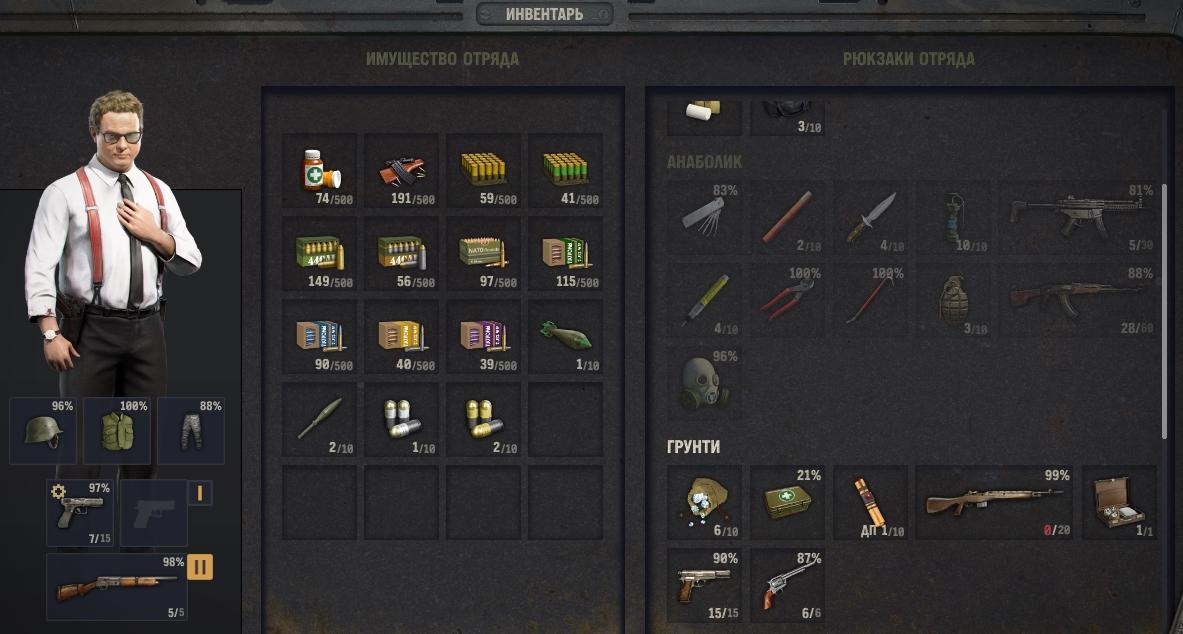 • Рюкзак. У каждого наёмника есть свой рюкзак, размер которого зависит от силы. Например, у мощного Анаболика одиннадцать ячеек, в то время как у Мыши всего четыре. У предметов нет веса, но длинные стволы и некоторые пистолеты-пулемёты занимают две ячейки.