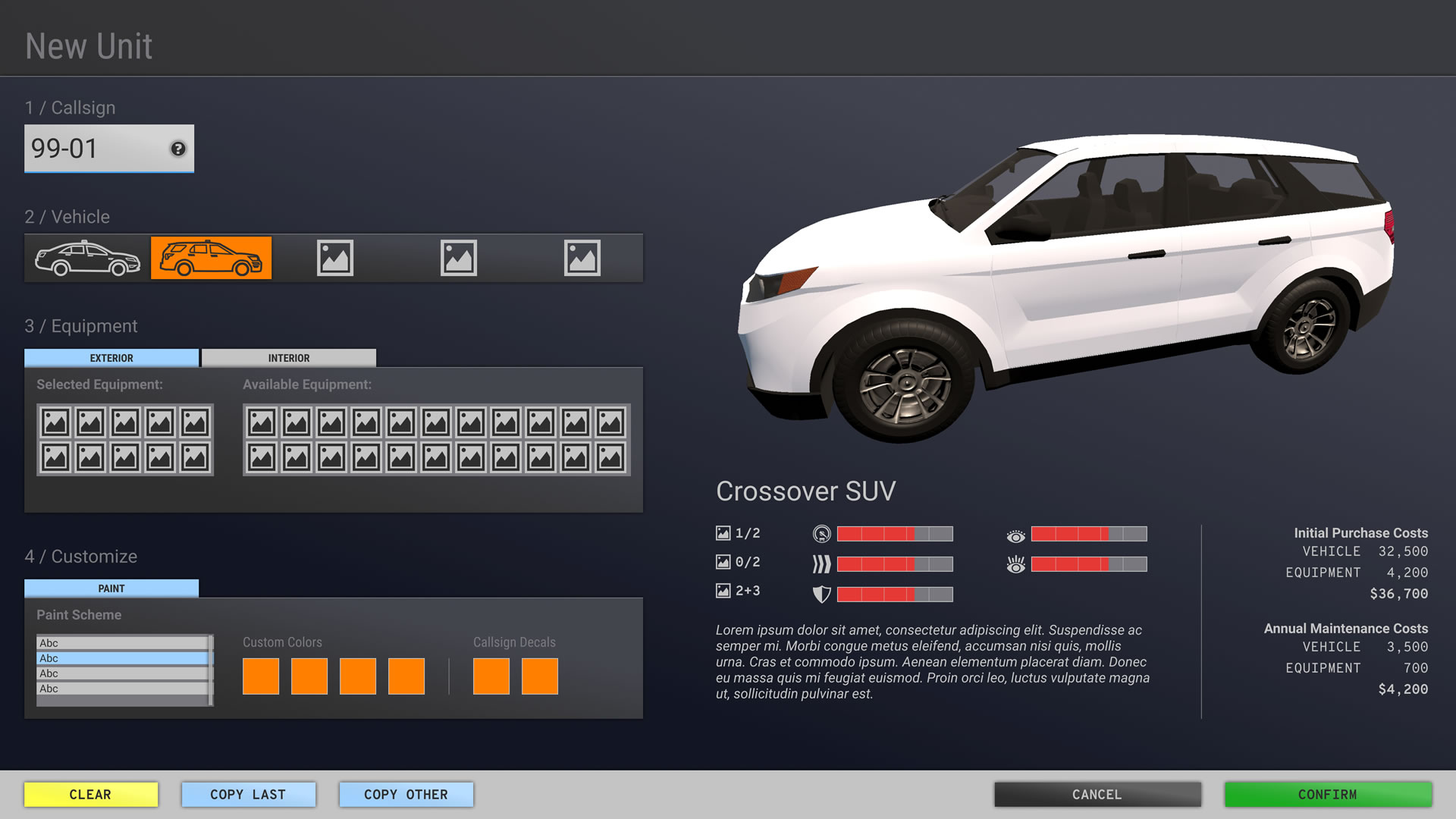 На скриншоте выше можно увидеть белый полицейский кроссовер и доступные возможности кастомизации. Игрок сможет выбрать тип раскраски или создать собственный набор цветов, установить внешнее и внутреннее оборудование для автомобиля. Также в окне кастомизации указаны параметры автомобиля, описание модели, стоимость её приобретения и содержания. Пока что это концепт-скриншот, демонстрирующий общую стилистику интерфейса и возможности игры – многие элементы заменены плейсхолдерами.