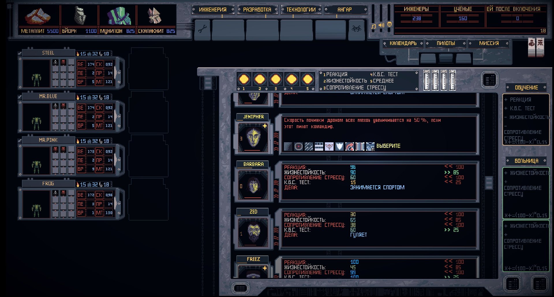 Пилоты поднимают уровень, получают новые навыки, улучшают свои характеристики. Игроку доступно обучение одного пилота и оздоровление двух единовременно, остальные заняты тем, чем заняты.