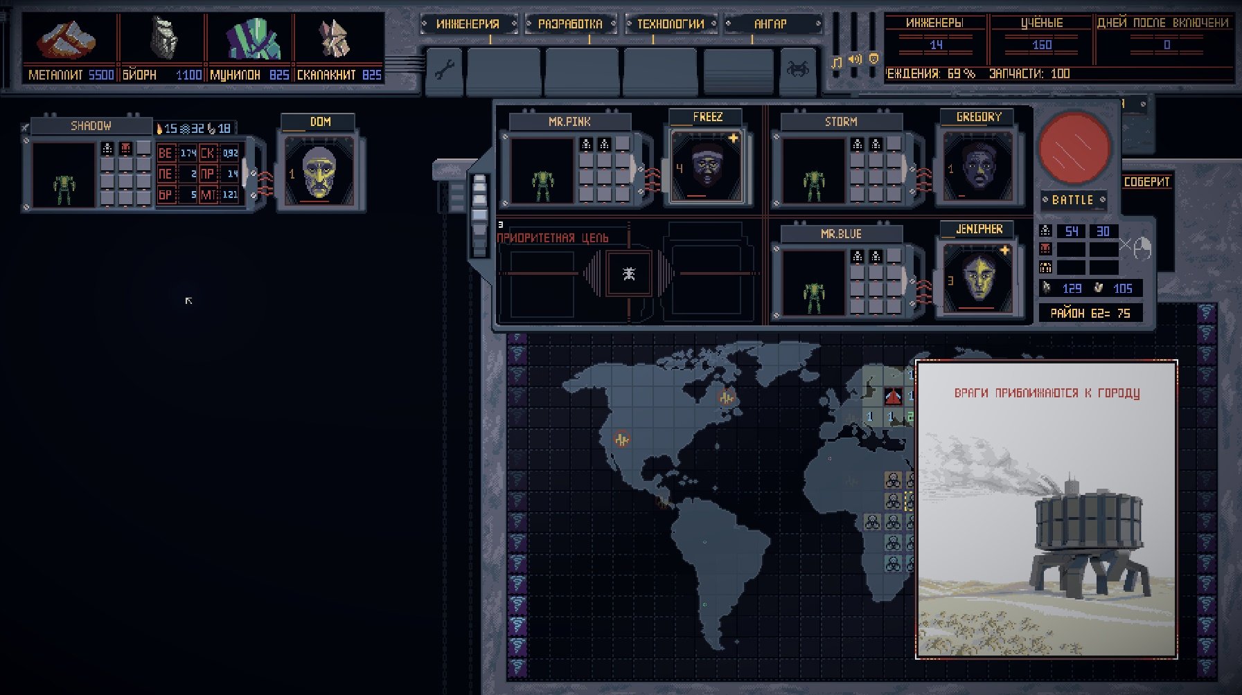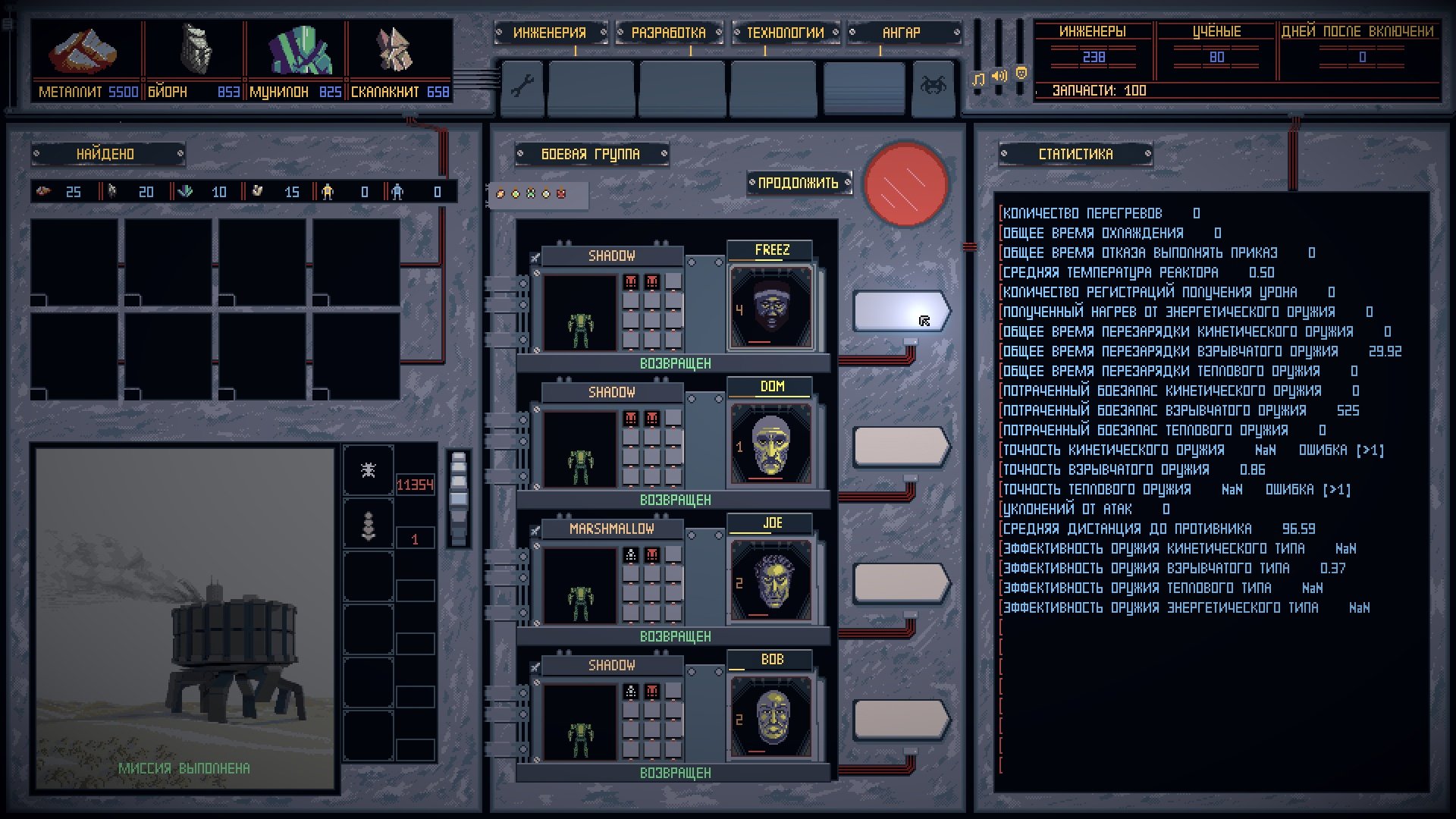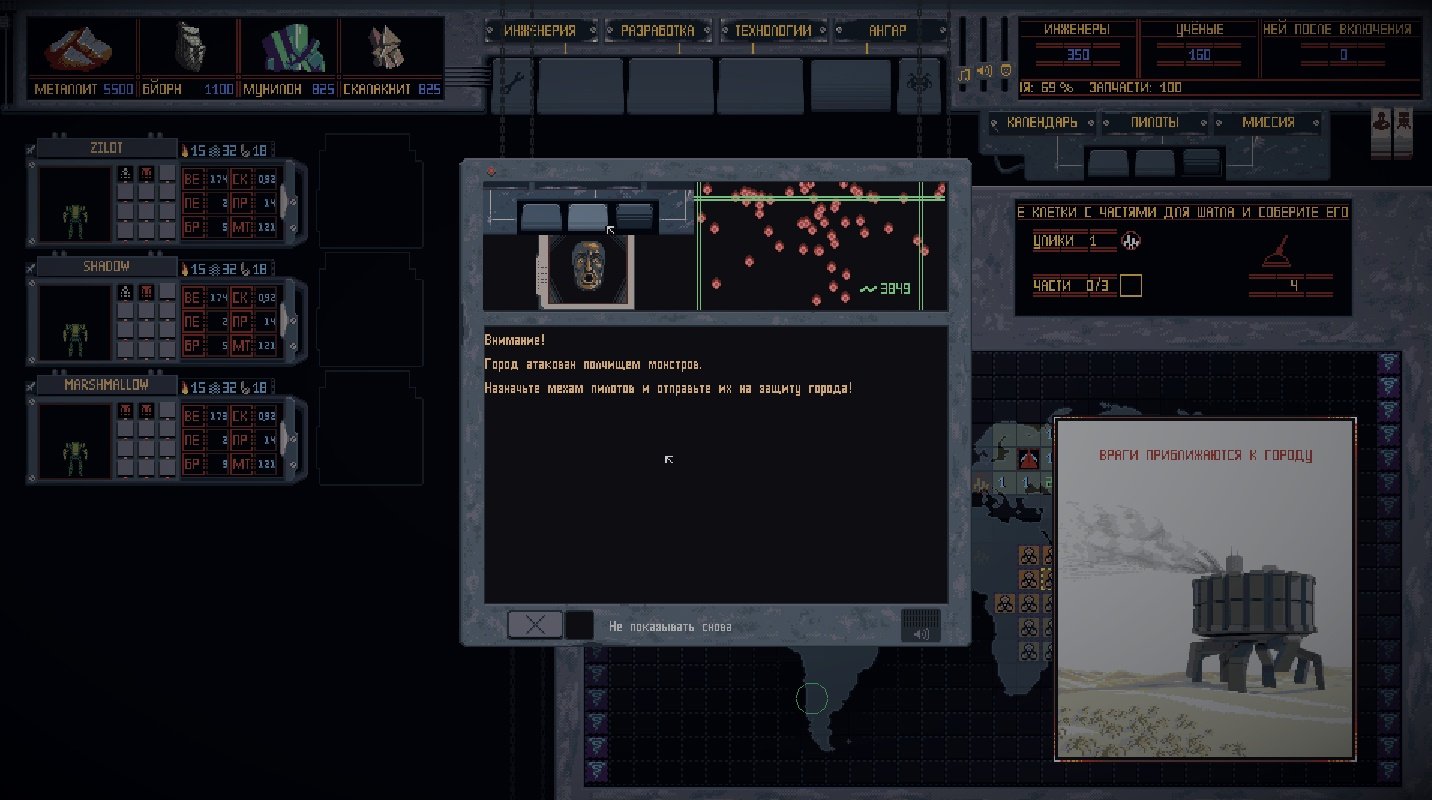 Сразу после окончания защиты города будут получены все собранные за миссию ресурсы и приобретённый пилотами опыт. На этом инструкции закончатся. Само прохождение миссии тоже выглядит немного непривычно. Игрок как будто оператор – наблюдает за происходящим и видит все возможные характеристики и состояния своих подчинённых.