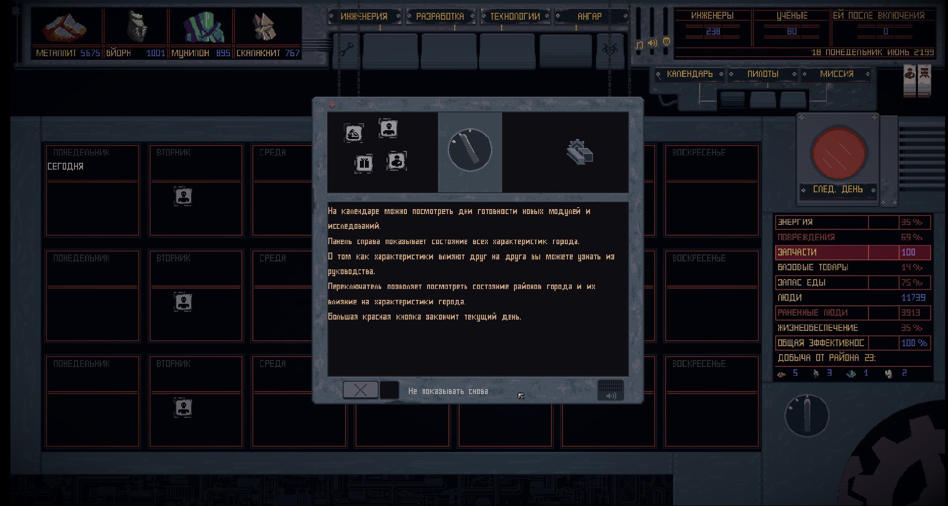 Календарь – он же конец хода. Выполнив все доступные игровые действия для продвижения дальше нужно перейти в следующий день. На календаре отображены тайминги получения ресурсов и окончания исследований.