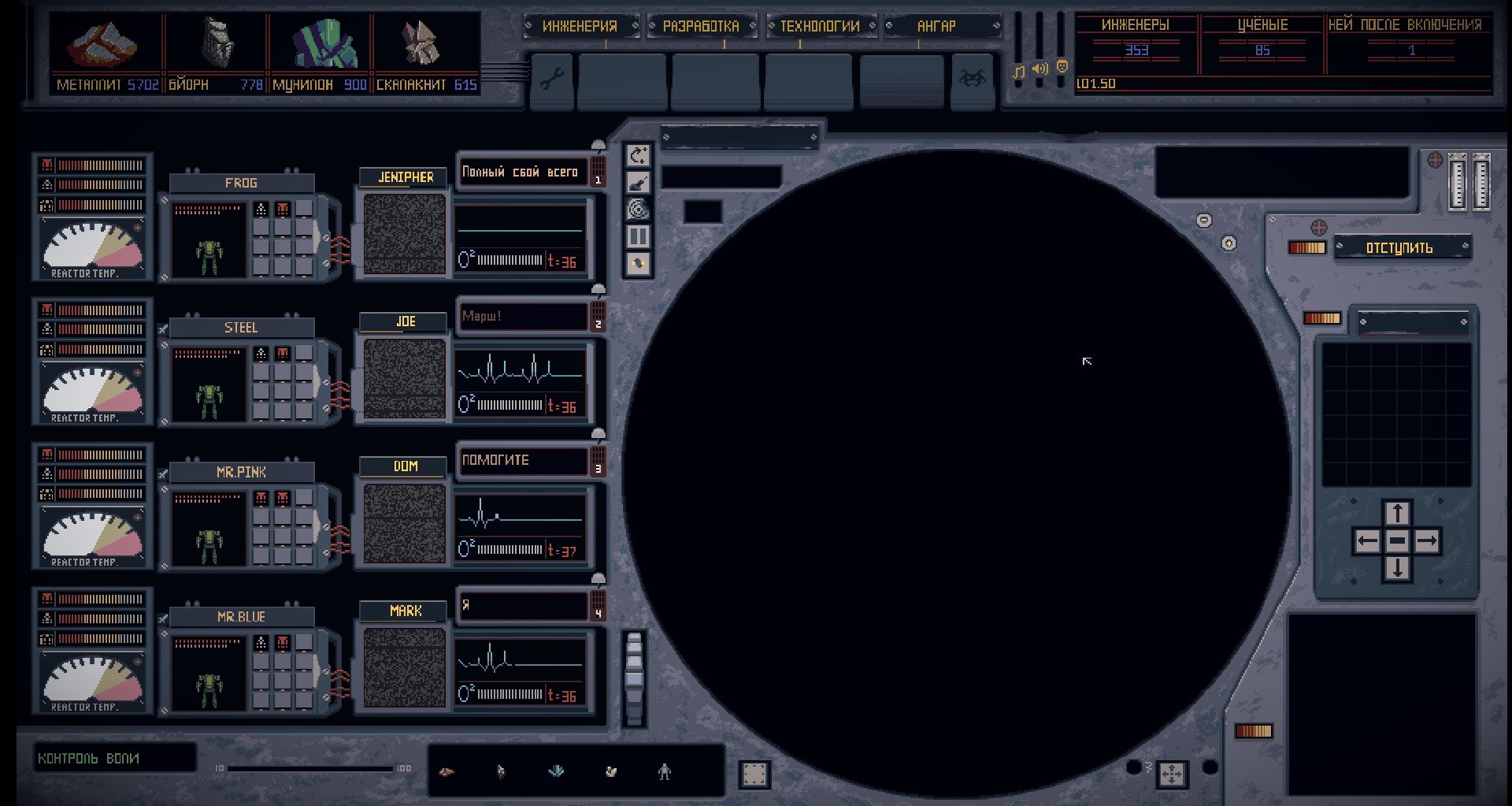 Игра выглядит весьма своеобразно и имеет достаточно плотно набитый интерфейс. И прежде чем перейти к геймплею, игроку придётся с ним хоть немного разобраться, но про это позже – из огня да в полымя. Прямо на старте ИИ оповещает, что наш “ходячий замок” находится под атакой (где бы ни было выбрано место старта) и предлагает отбить натиск. Надо всего лишь собрать ещё 1 мех к трём уже имеющимся. Собираем реактор, оснащаем мех всем чем только можно, грузим в него пилота, пополняем квартет защитников и на миссию.