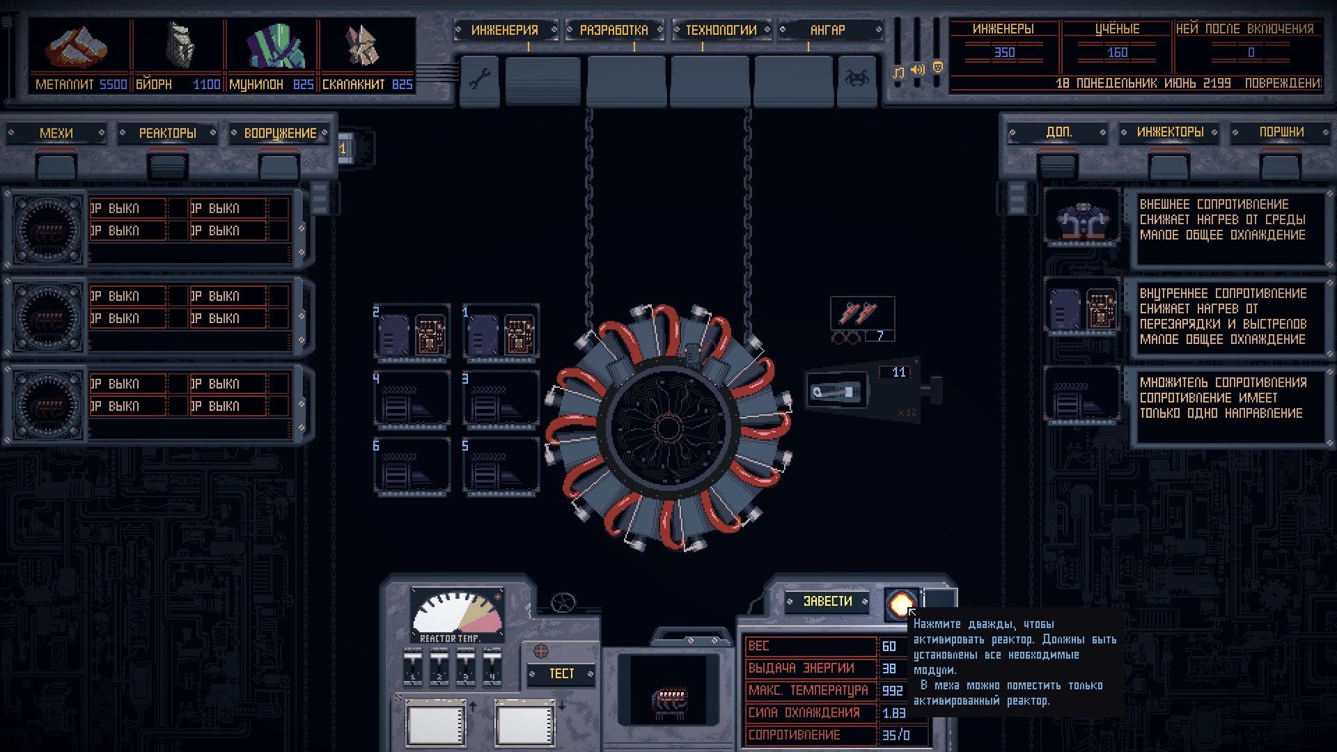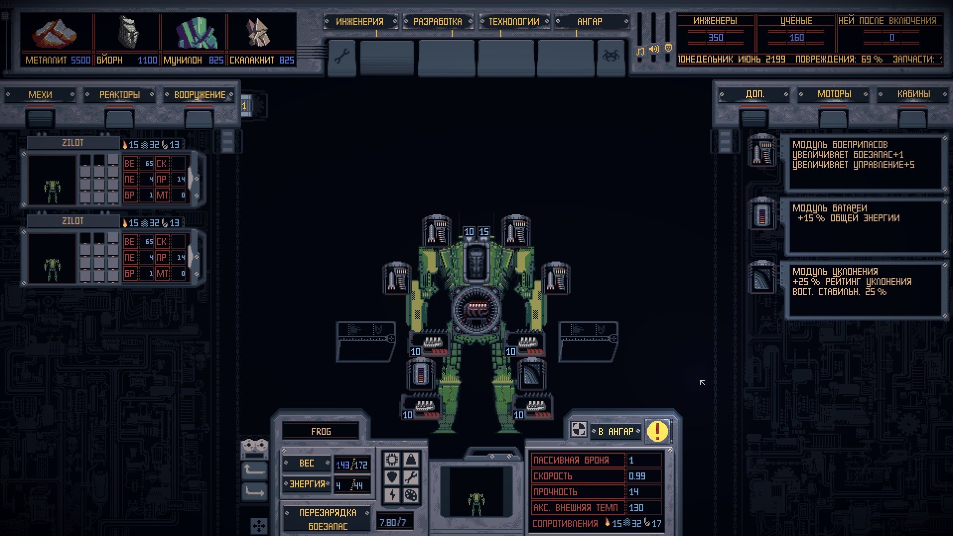Инженерия и разработка – 2 основных игровых раздела, в одном создаются и улучшаются мехи и их комплектующие, во втором разрабатываются и заказываются новинки, ну и ненужно можно разобрать.