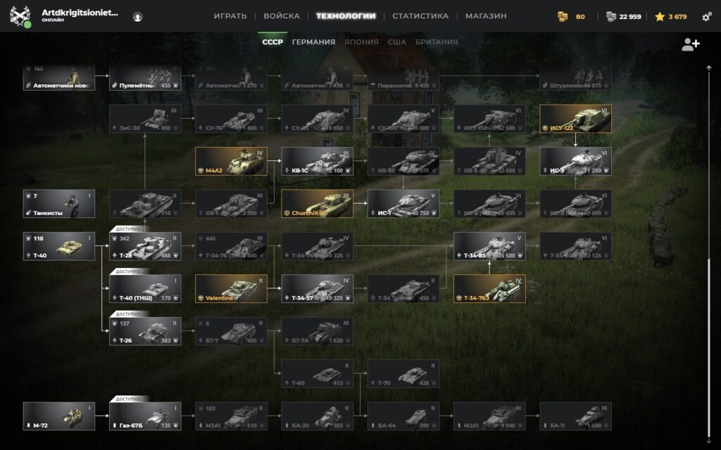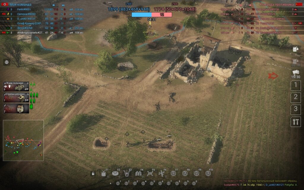 А вот если вы хотите добавить в свой полк настоящий Королевский Тигр или ИС, то придётся пройти всё дерево технологий и исследовать их, а потом ещё покупать каждую единицу за серебро. Опыт и серебро зарабатываются за участие в боях, причём каждый юнит зарабатывает опыт отдельно и именно опыт конкретного юнита нужен для того, чтобы открыть следующий за ним в линейке. Даётся и некоторое количество свободного опыта, которое можно потратить на прокачку любого юнита по желанию (привет, World of Tanks). На данный момент в игре присутствуют две нации – СССР и Германия, но планируется гораздо больше. На момент ЗБТ сражаются все против всех, т.е. вы можете играть за СССР и встретить врага, играющего за СССР.