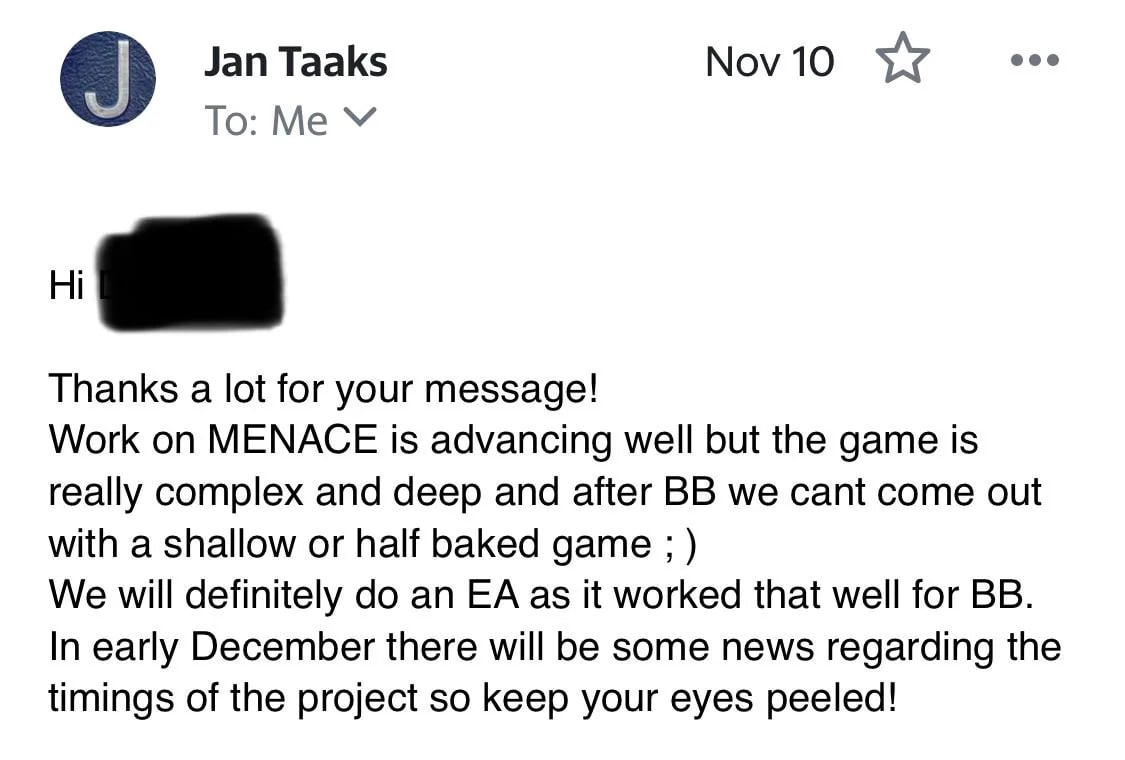 Фанат Battle Brothers под ником Dewderson в ожидании следующей игры студии MENACE написал на почту разработчикам. В письме он задал вопрос о том, действительно ли выйдет игра в 2024 году, как сейчас указано в Steam.