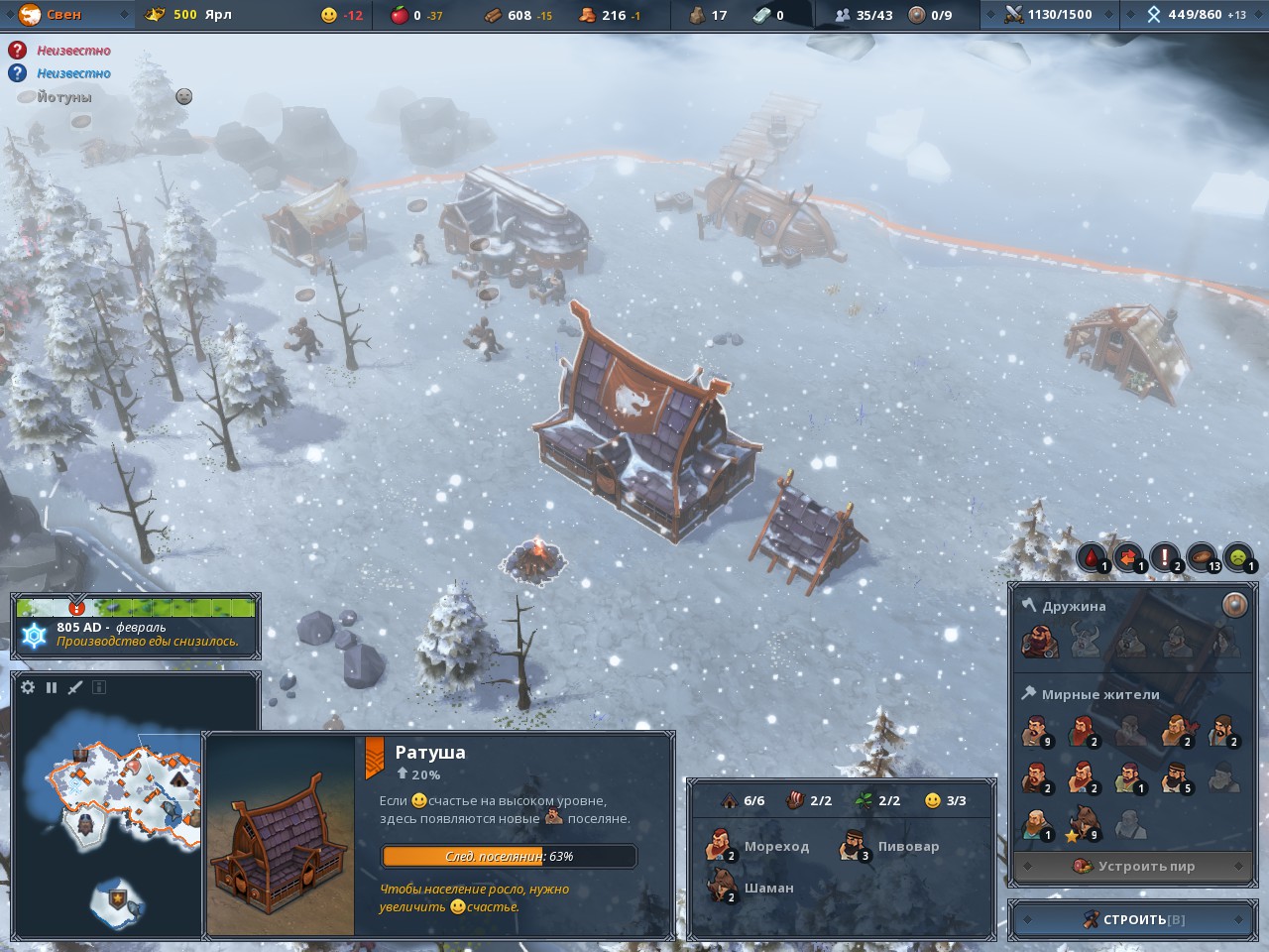 Однако самый главный ресурс в игре – это люди. Чтобы получить рыбака, охотника или дровосека, достаточно просто отправить поселенца в соответствующее здание. Но тут можно столкнуться с дисбалансом: еду начинают собирать на одного жителя меньше, а потреблять её продолжают так же, как и до этого. То же самое и со счастьем – чем больше новых людей, тем ниже его показатель и нужно строить больше увеселительных заведений. Именно это и является главной трудностью в вопросах экономики – достичь идеального баланса.
