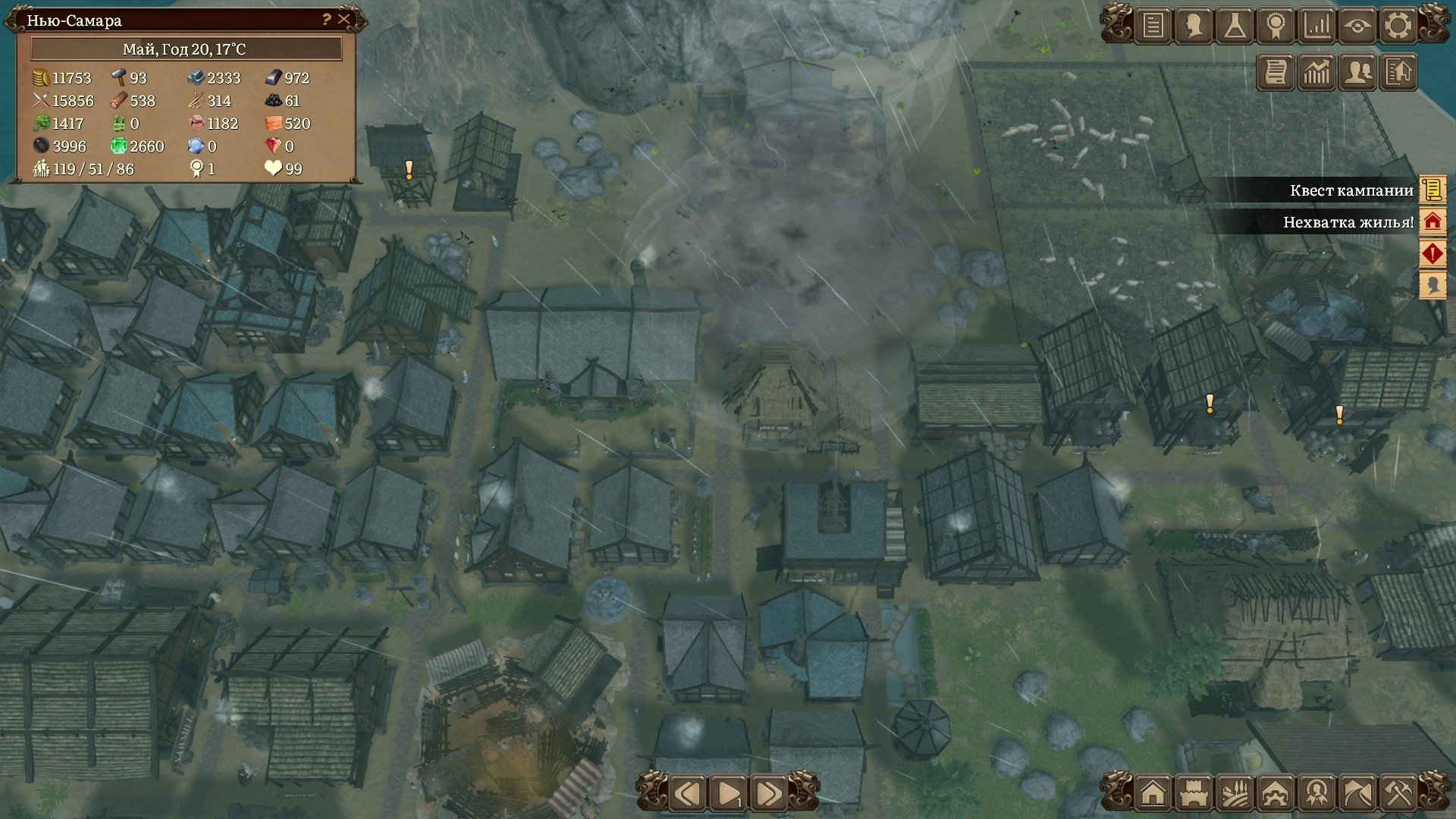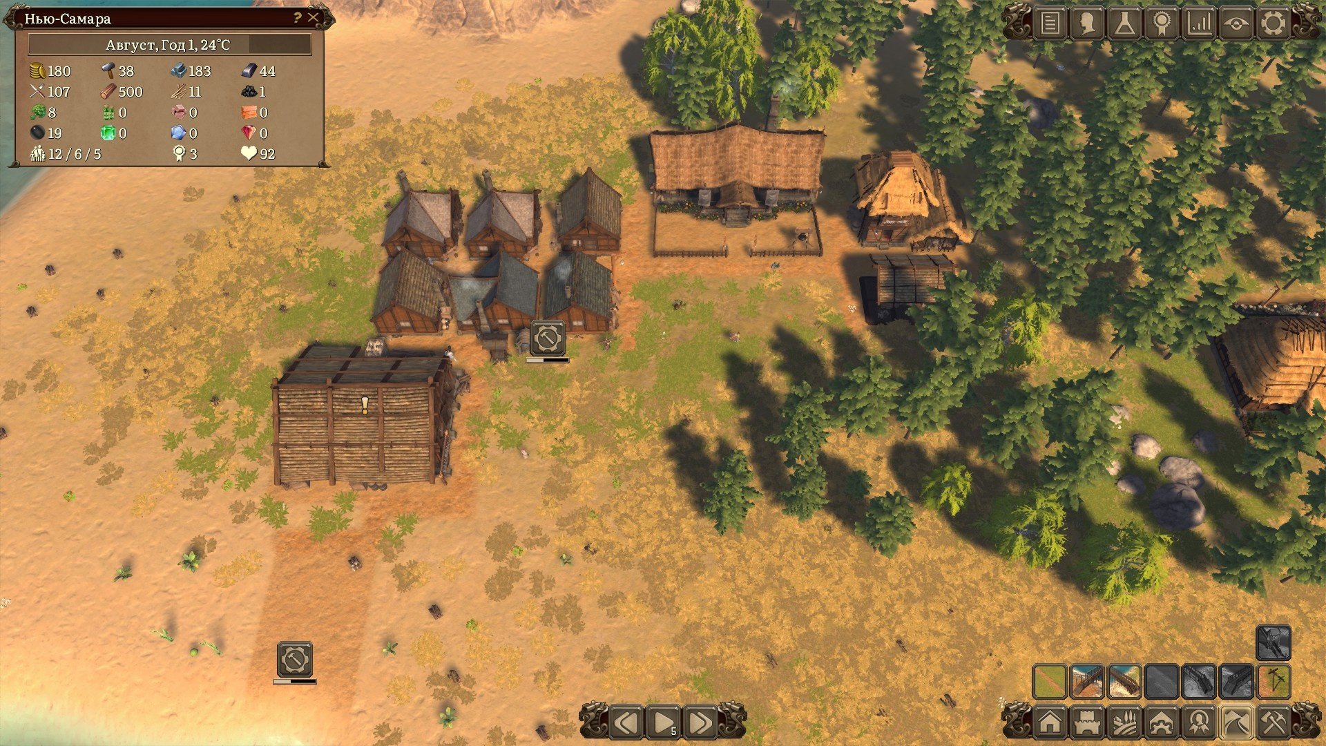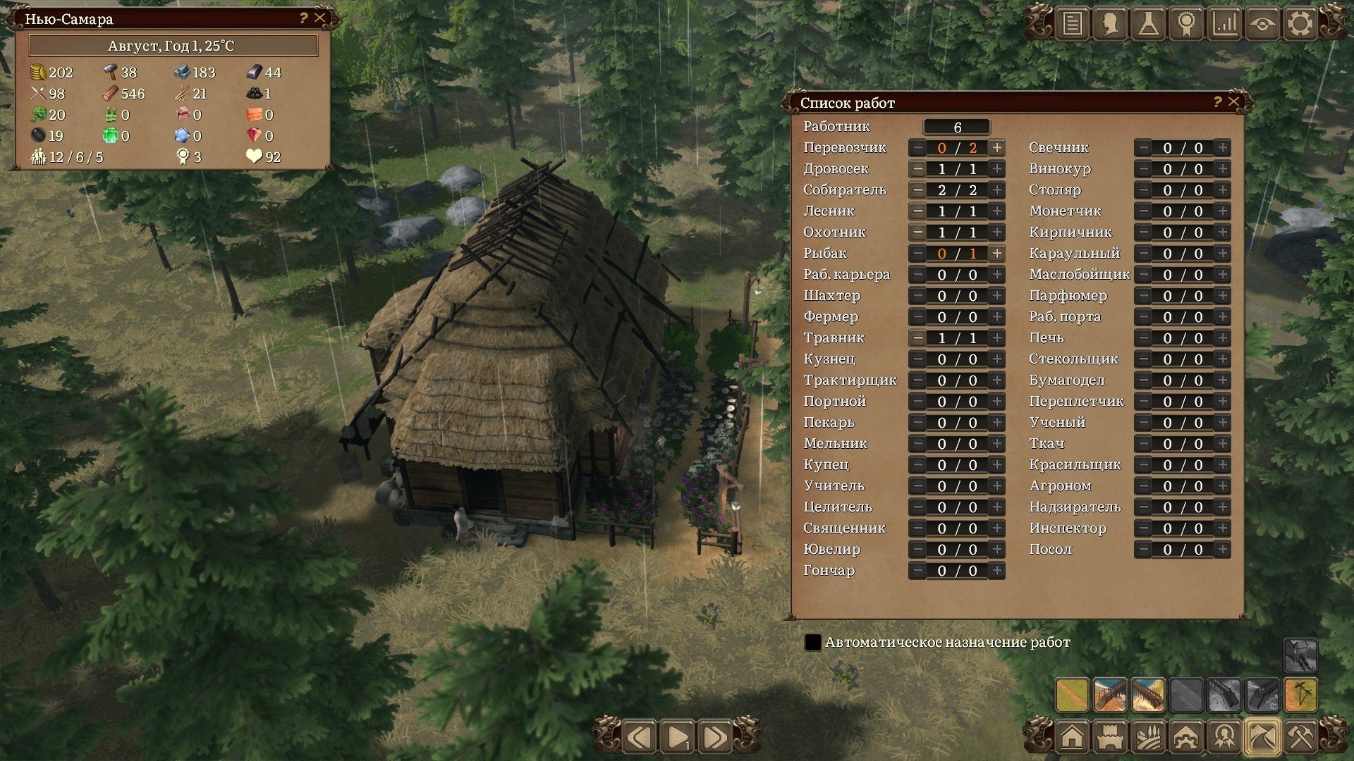 Распределение граждан на работы можно осуществлять вручную, а можно делать это в автоматическом режиме поставив соответствующую галочку. Эта механика почти до самого окончания кампании будет подкидывать вам задачки. Работ много, особенно если развивать деревеньку быстрыми темпами, а рабочих рук мало. Приходиться балансировать и перекидывать рабочих с разных задач, при этом всё-таки поддерживая минимальный уровень работяг на всех построенных производствах. А новых трудяг можно получить либо с помощью миграции, либо ваши поселенцы образуют семьи, заведут детей, те вымахают в подростков и только потом во взрослых, налогооблагаемых женщин и мужей. Это достаточно долго и придётся проявить терпение.
