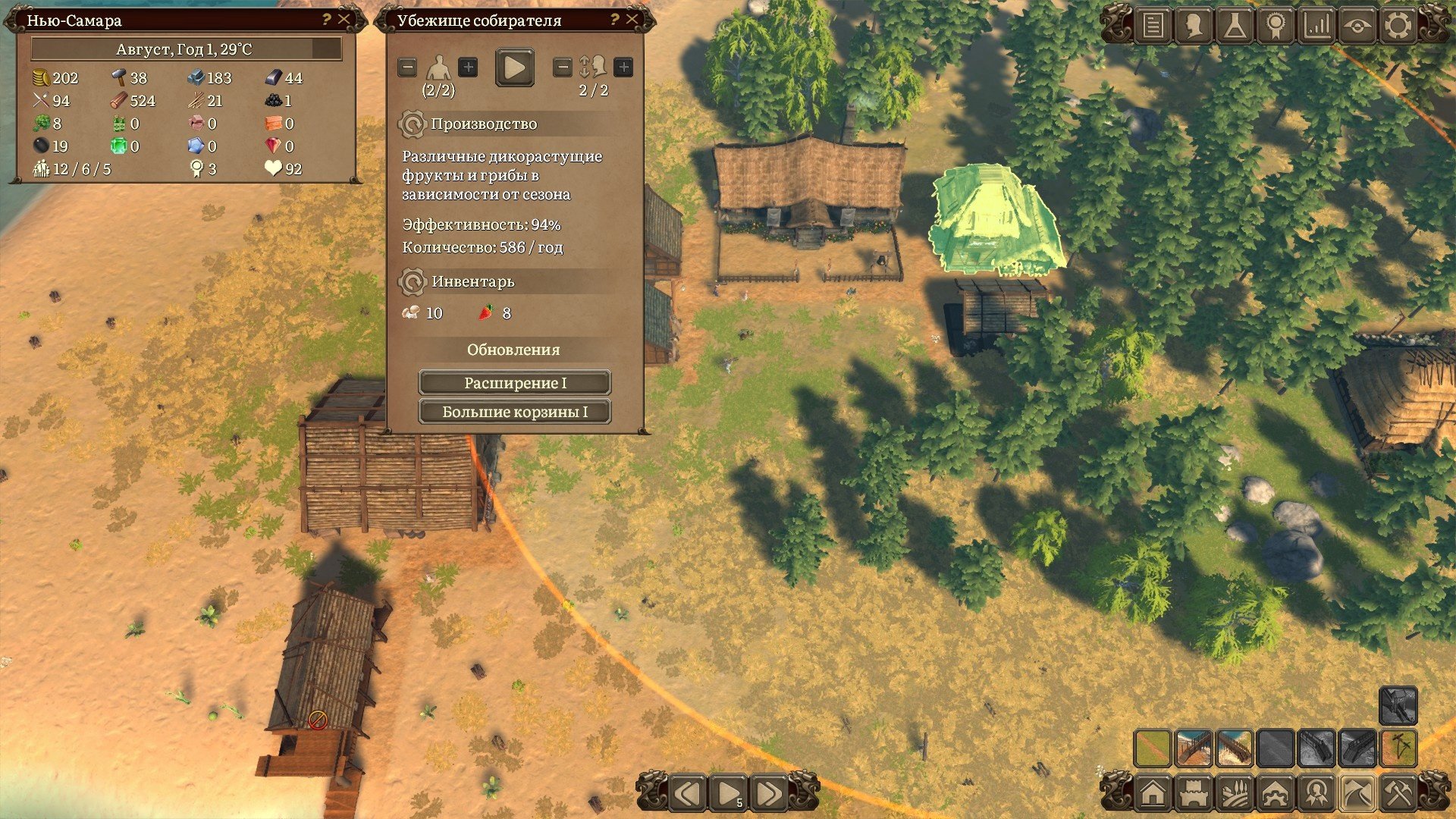 Ещё есть здания, которые дают увеличение эффективности для производств определённого типа в радиусе. Дом агронома даёт увеличение эффективности для садов, ферм и загонов со скотом.