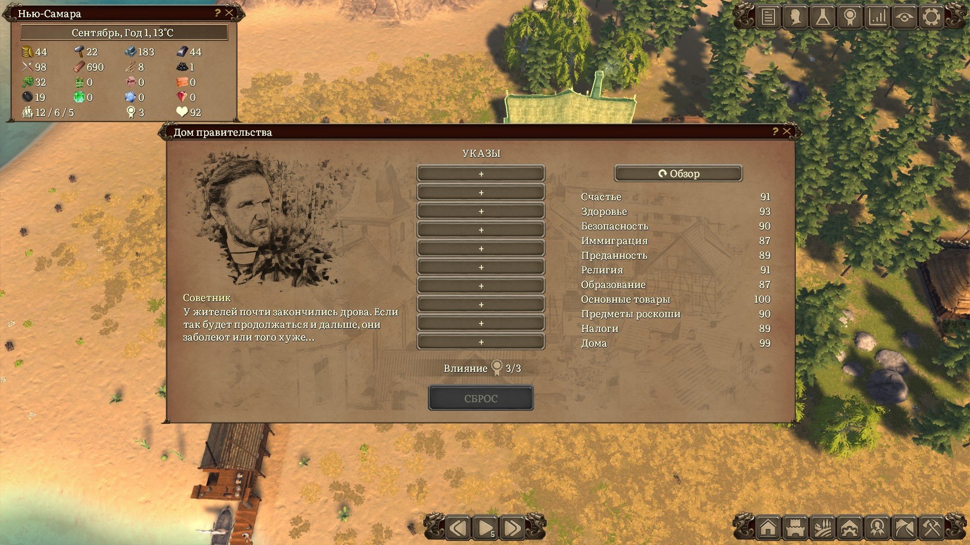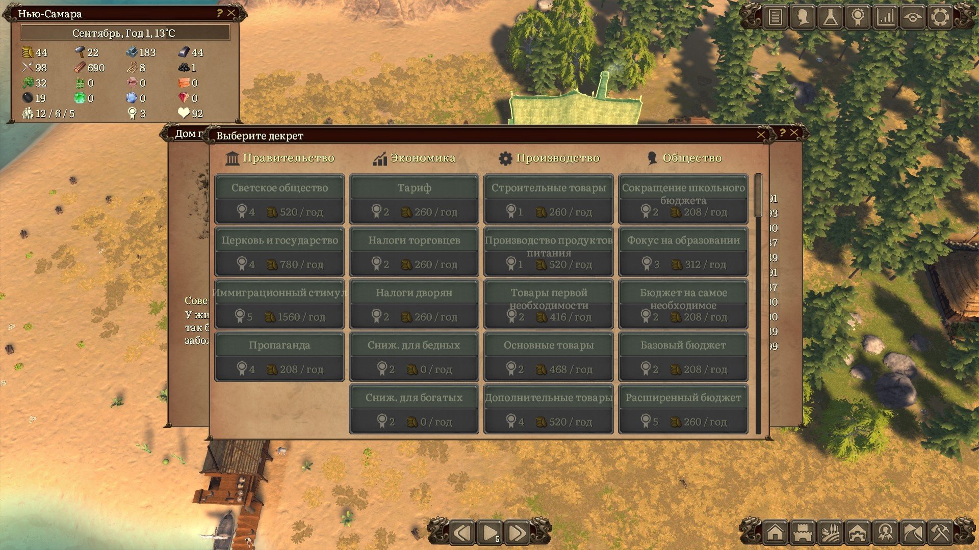…и на третий день воткнул он ратушу. Всё начинается с размещения мэрии, в ней можно будет на протяжении всей игры принимать указы в отношении граждан, мигрантов, налогов и производства ресурсов. Каждый указ имеет свою стоимость в очках решений и годовое содержание в золотых монетах. Очки решений не выступают в роли разового расходника. Количество решений и очков ограничено, отменяя указ вы возвращаете себе очки затраченные на него и можете перераспределить их на другие указы.