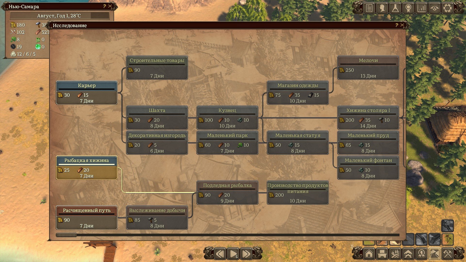 Ветка исследований очень проста и линейна, правда, логические связи присутствуют не всегда. В ветке за исследованием указа в отношении мигрантов абсолютно спокойно может следовать исследование пасеки. В целом это не имеет никакого значения, но если вдруг найдутся адепты исключительной логичности происходящего в игре, то я вас предупредил. На исследования построек требуются ресурсы и деньги, а на указы и постоянные улучшения для добывающих и производственных зданий только деньги. Меня эта простота подкупает, вся игра выполнена в концепции чила и расслабления. Средневековые декорации, мощённые улицы, телеги и струйки дыма из труб домов настраивают на нужный лад. И потому такая, можно сказать, примитивная ветка исследований отлично вписывается в игру.