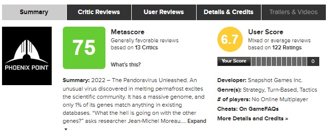 Традиционно для того, чтобы посмотреть оценки, игроки заходят в Steam, но на этот раз ситуация усложняется, поскольку игра является эксклюзивом для магазина Epic Games Store, в котором пока что нет системы отзывов. В таком случае можно обратиться на наиболее популярный ресурс с отзывами об играх и фильмах Metacritic, на котором Phoenix Point на данный момент имеет пользовательскую оценку 6.7 и оценку критиков 75.