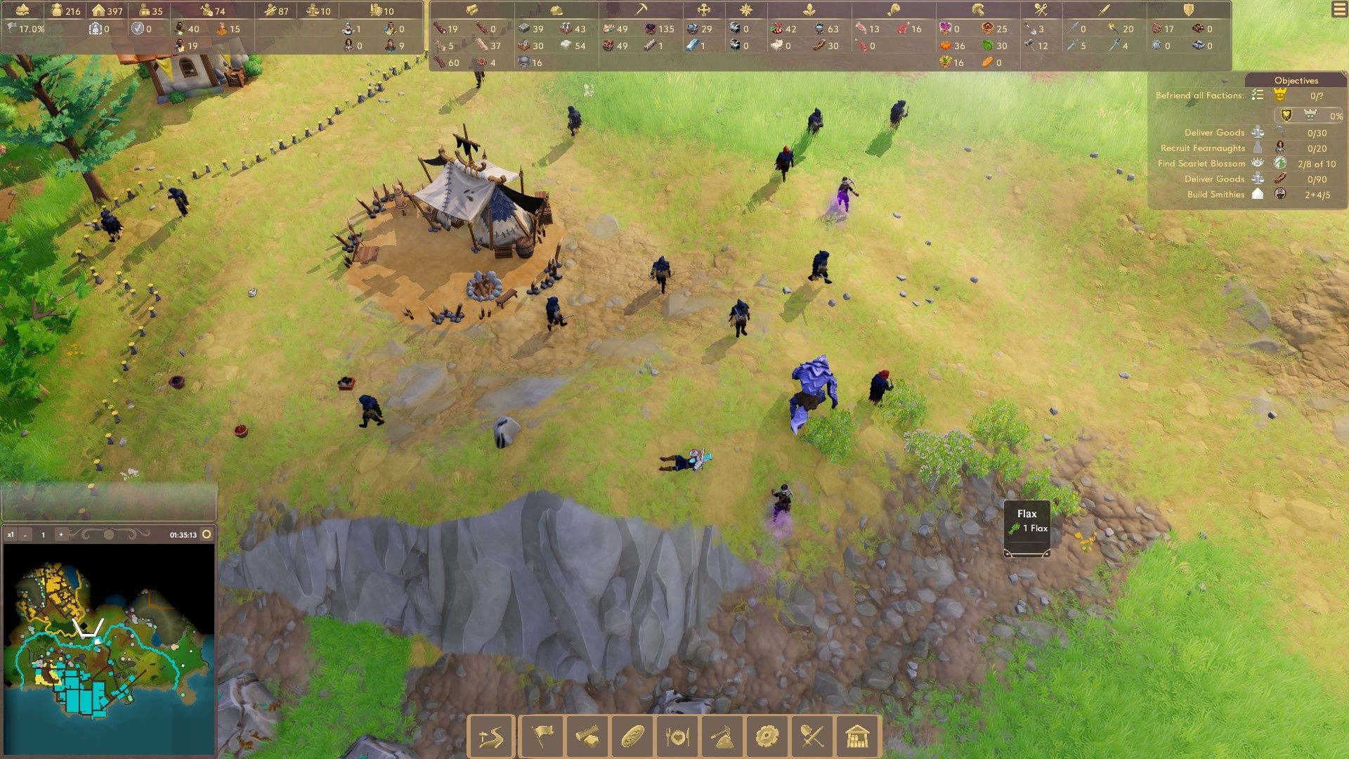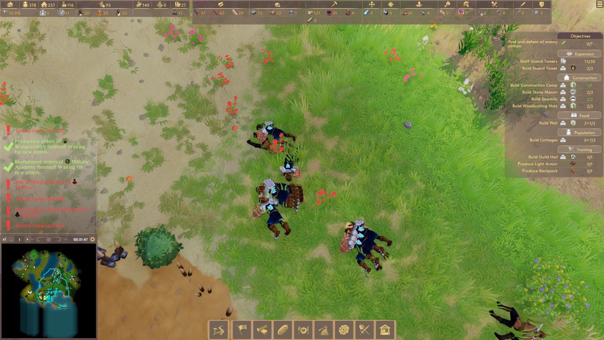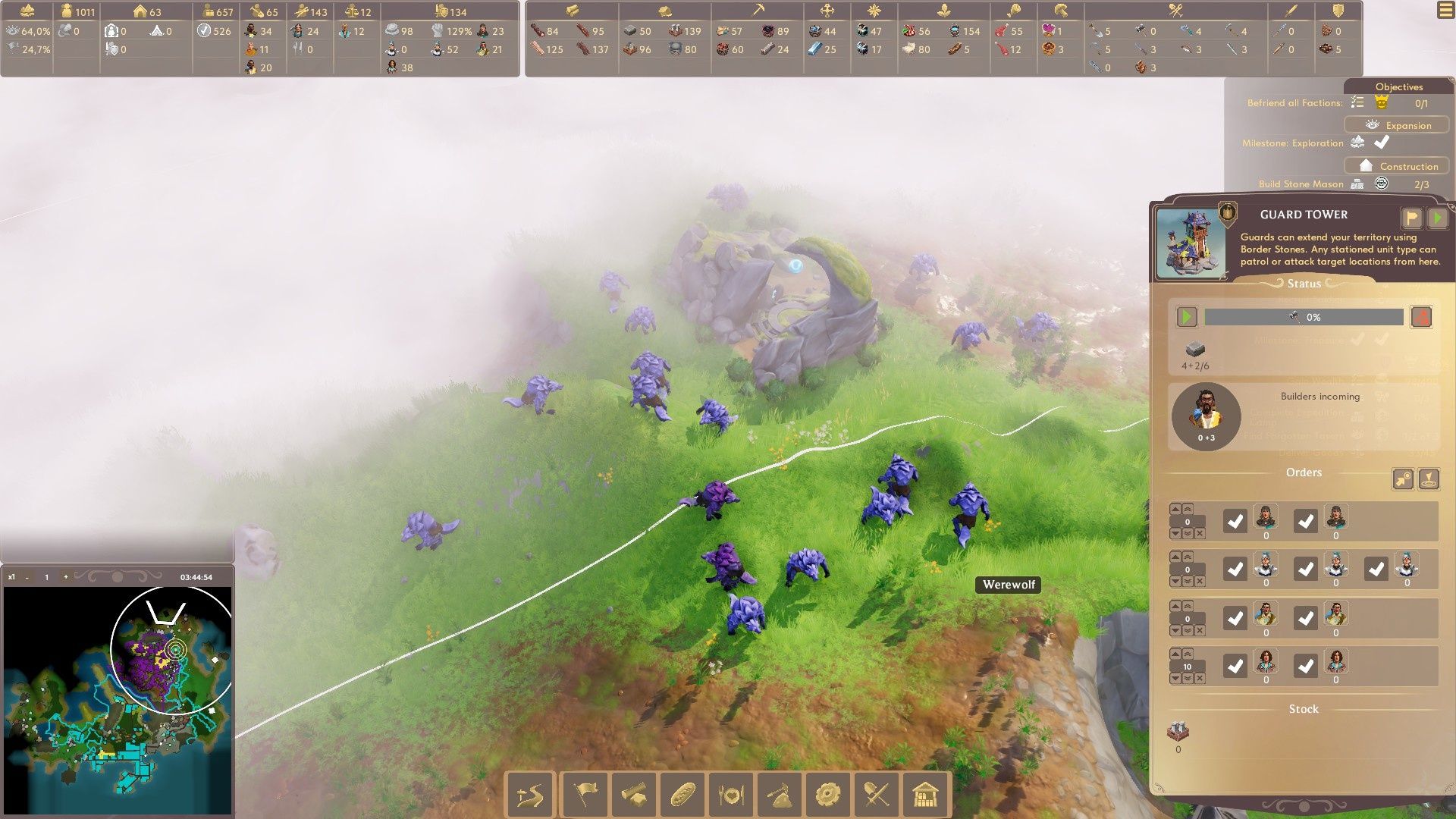 Расскажу случай: для задания, требовалось восстановить лагерь исследователей и занести туда определённое количество ресурсов. Лагерь на карте обнаружили, заклеймили стражниками и тут первая беда: дорогу провести через лес невозможно, ибо слишком густой. Ладно. Строю хижину лесоруба и начинаю ему ставить фокус где рубить. С каждым деревом. Потому как лесоруб будет рубить то, что ближе к центру фокуса. Вроде дело продвигается, но тут набежали бандиты и распугали рабочих. Ладно… Строю сторожку и ставлю туда солдат на охрану+продолжаю заниматься другими делами. Игра идёт, а лагерь всё не строится, хотя готовность 99% и держится. Смотрю на ситуацию и вижу, что выбежавшие на дорогу кабаны распугивают носильщиков и вокруг них уже просто гора требуемых копий. Солдатам похрен, так что строю там охотника, выбираю галочки для уничтожения кабанов и жду. Долго жду. Оказывается, охотник не считает нужным кого-то убивать, потому как места для мяса больше нет. Ладно… Строю склад для кабанятины и тут дело задвигалось, но прибежали оборотни, а о них я поведаю чуть позднее.