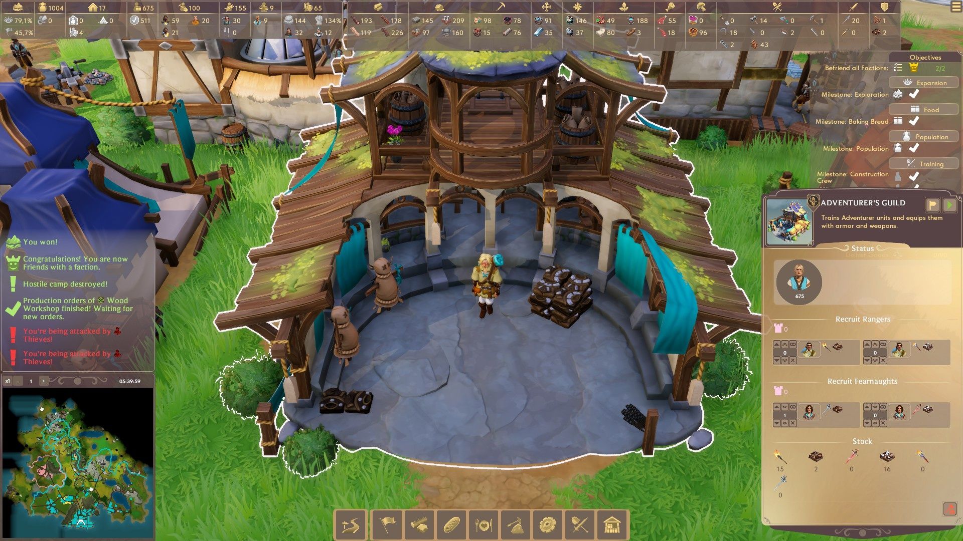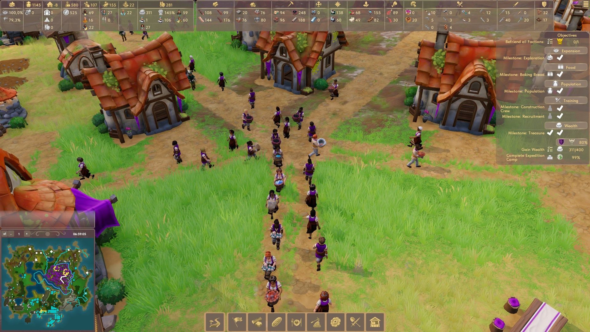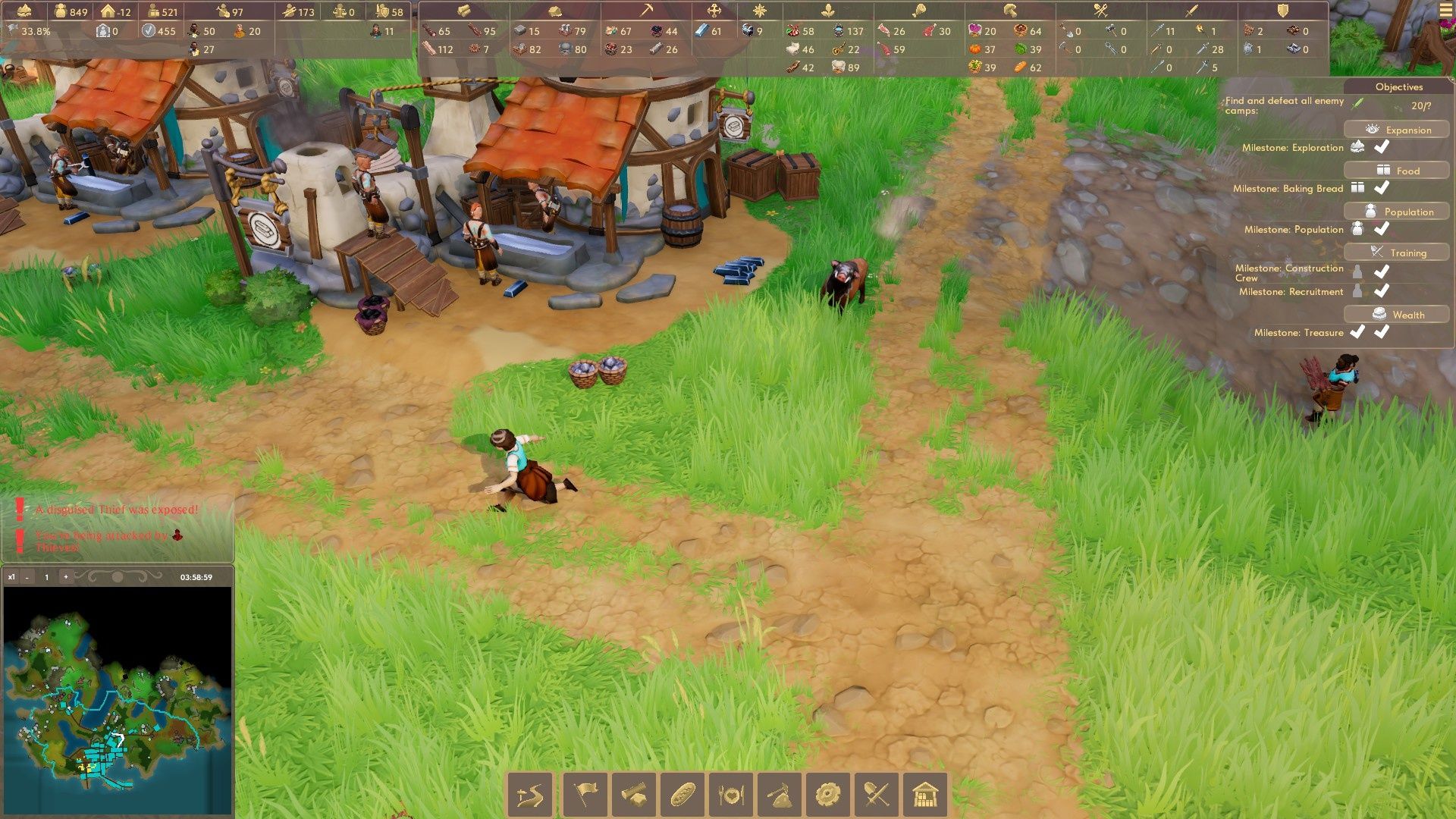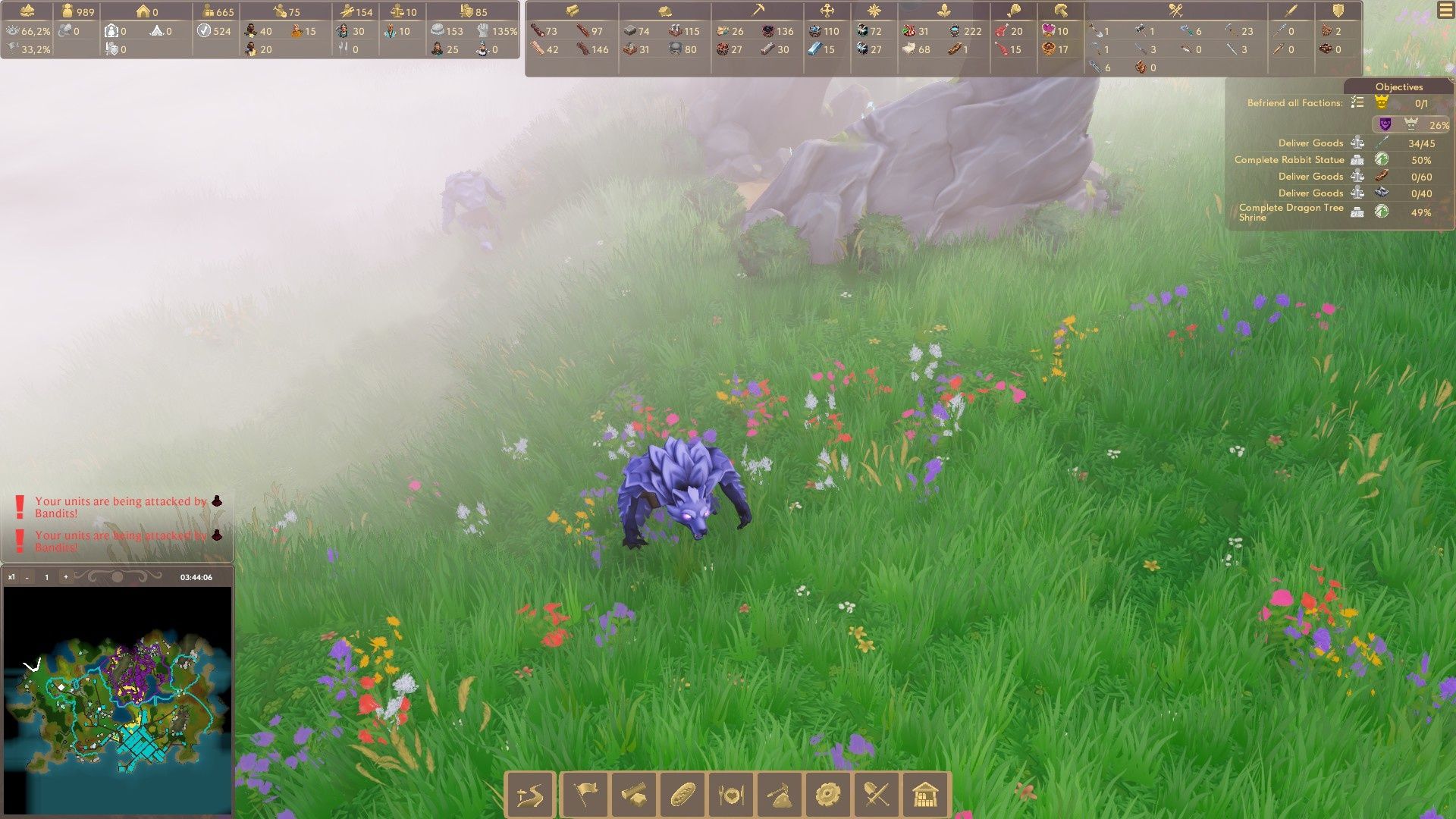 Расскажу случай: для задания, требовалось восстановить лагерь исследователей и занести туда определённое количество ресурсов. Лагерь на карте обнаружили, заклеймили стражниками и тут первая беда: дорогу провести через лес невозможно, ибо слишком густой. Ладно. Строю хижину лесоруба и начинаю ему ставить фокус где рубить. С каждым деревом. Потому как лесоруб будет рубить то, что ближе к центру фокуса. Вроде дело продвигается, но тут набежали бандиты и распугали рабочих. Ладно… Строю сторожку и ставлю туда солдат на охрану+продолжаю заниматься другими делами. Игра идёт, а лагерь всё не строится, хотя готовность 99% и держится. Смотрю на ситуацию и вижу, что выбежавшие на дорогу кабаны распугивают носильщиков и вокруг них уже просто гора требуемых копий. Солдатам похрен, так что строю там охотника, выбираю галочки для уничтожения кабанов и жду. Долго жду. Оказывается, охотник не считает нужным кого-то убивать, потому как места для мяса больше нет. Ладно… Строю склад для кабанятины и тут дело задвигалось, но прибежали оборотни, а о них я поведаю чуть позднее.