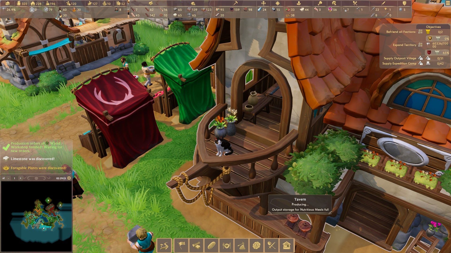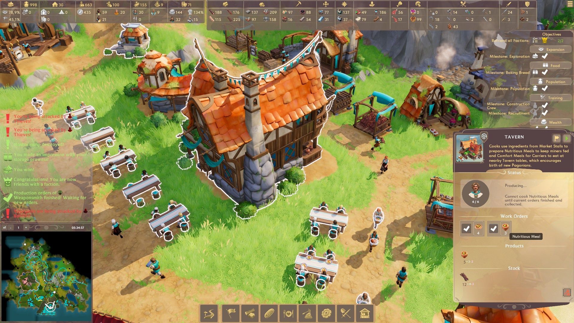 Возьмём, например, продуктовую составляющую. В игре еду можно получать охотой, собирательством и сельским хозяйством (рыба видимо в стране не водится). Разных продуктов целых девять штук. В таверне из них готовят еду для шахтёров и еду для населения. Какие продукты подходят для какой еды и сколько их уходит на единицу продукции совершенно непонятно и это нигде не рассказывается. Также, при таверне надо обязательно построить столы для едоков, но сколько и из чего рассчитывать количество этих столов тоже не посчитали нужным пояснить. Просто в обучении сказали: строй 4 и будет тебе счастье. Ещё ни в одной партии в Pioneers of Pagonia у меня не было необходимости строить вторую таверну. И вроде создаёт она совсем не так уж много пищи, но несмотря на тысячное население и ораву прожорливых шахтёров поварята справлялись на ура.