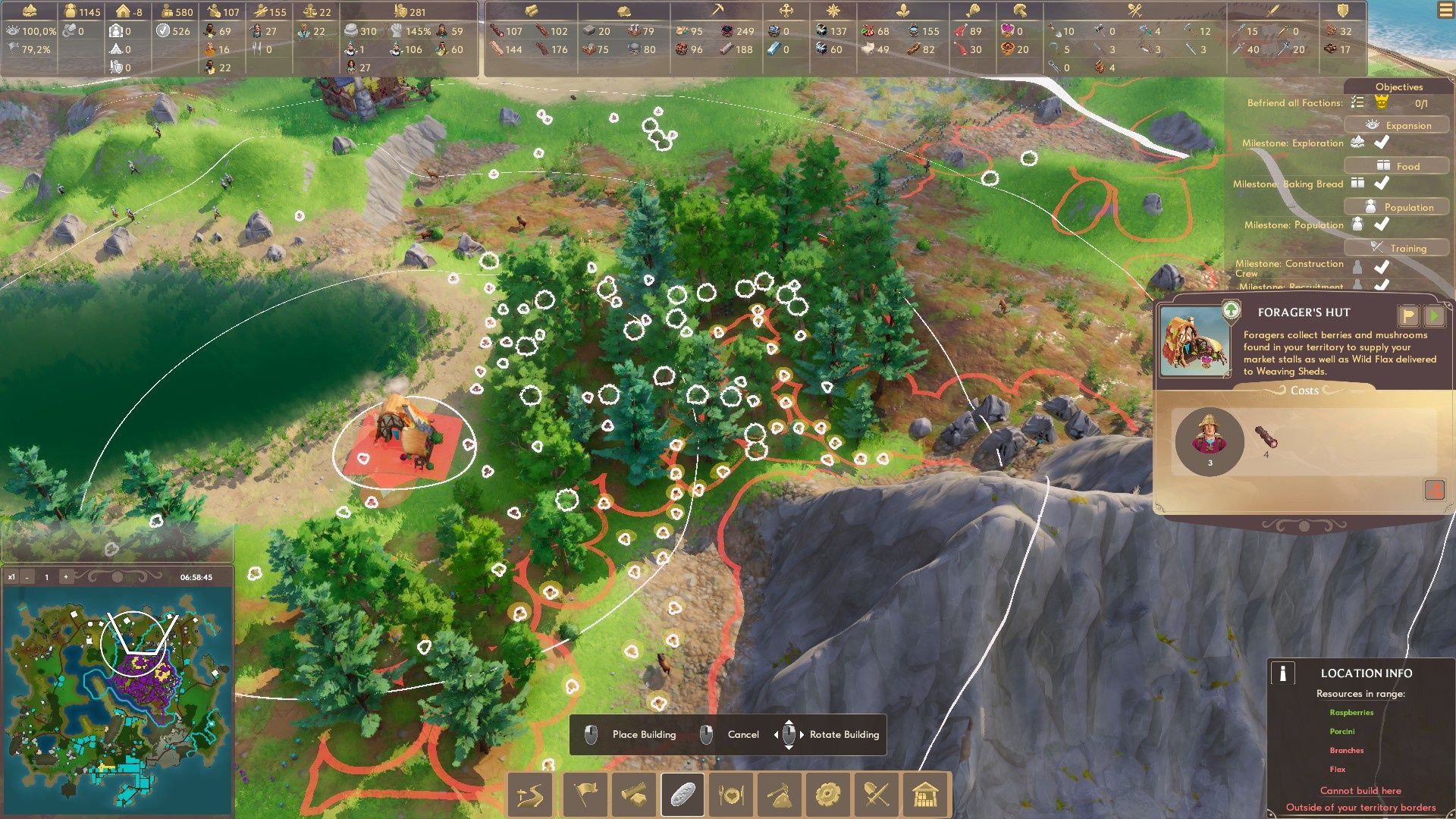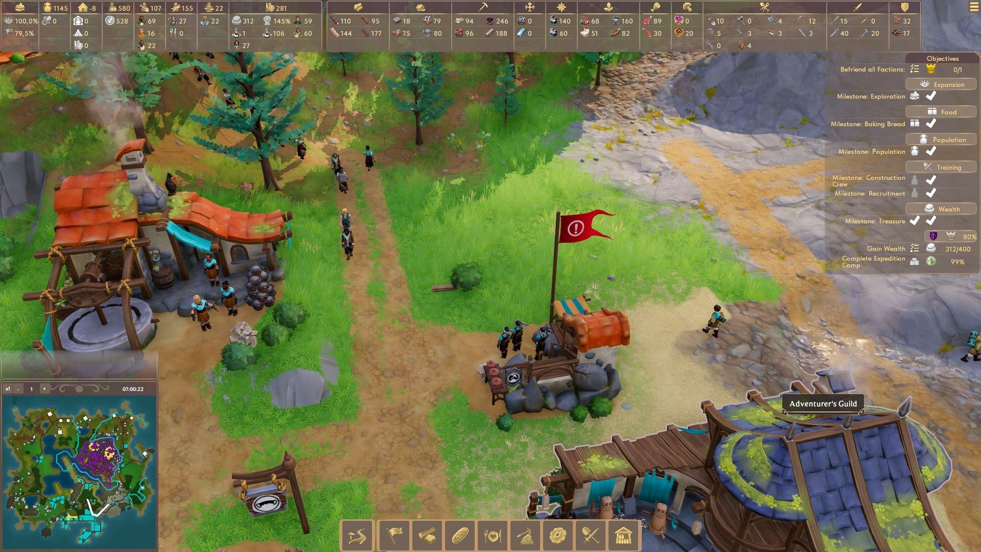 Скарба у нас с собой немного, но вполне хватит на постройку базовых потребностей вроде камня, пиломатериалов и тех, кто должен это охранять. Пища, кстати, в базовые потребности не входит и нужна только для корма шахтёрам и размножения. Потому, пока у вас не появилось необходимости в данных аспектах, можете смело заставлять граждан питаться подножным кормом. Не сказать, что это свежая инновация. По сути, в классической серии пища также была только частью производственной цепочки, но никак не прямым условием выживания. Если раньше она была нужна хотя бы для производства железа, без которого не было бы солдат, то теперь можно просто заточить ветку и вот у вас уже есть базовый стражник. Он мало что может, но хотя бы есть не просит.