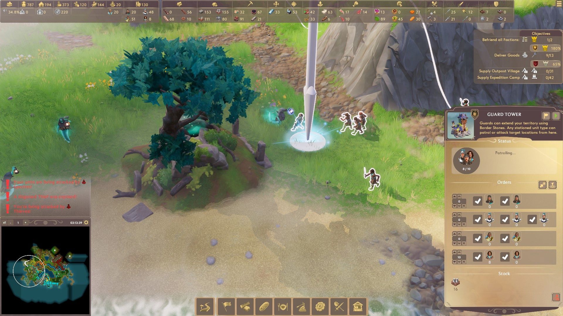 Предотвращать ущерб можно, патрулируя местность и здесь вы снова лбом упрётесь в корявое управление. В каждой башне, способной разместить солдат есть определённое количество слотов (10 в башне и 25 в гарнизоне). Каждой башне можно назначить ТОЛЬКО ОДНУ точку патрулирования. Даже возможность патрулировать от точки до точки разрабы не предусмотрели, а противник оказывается не совсем дурак и любит менять маршруты.