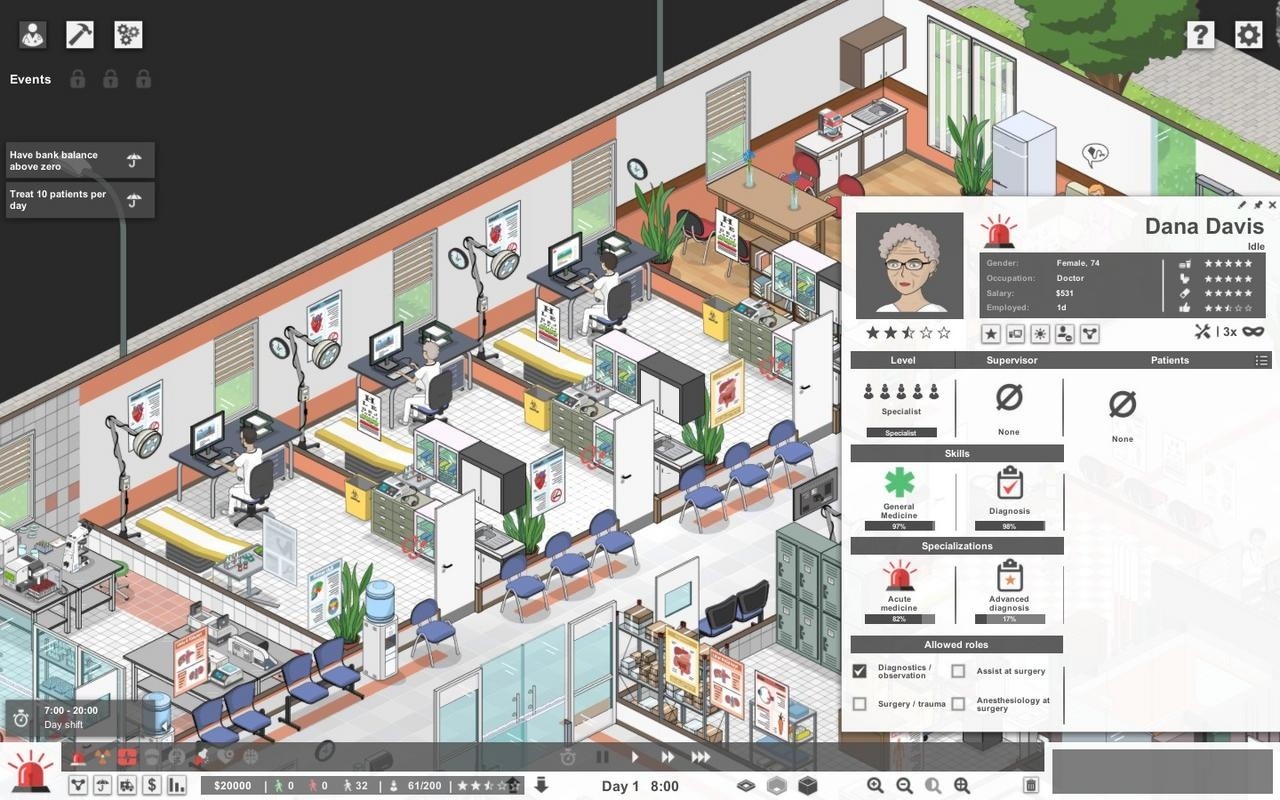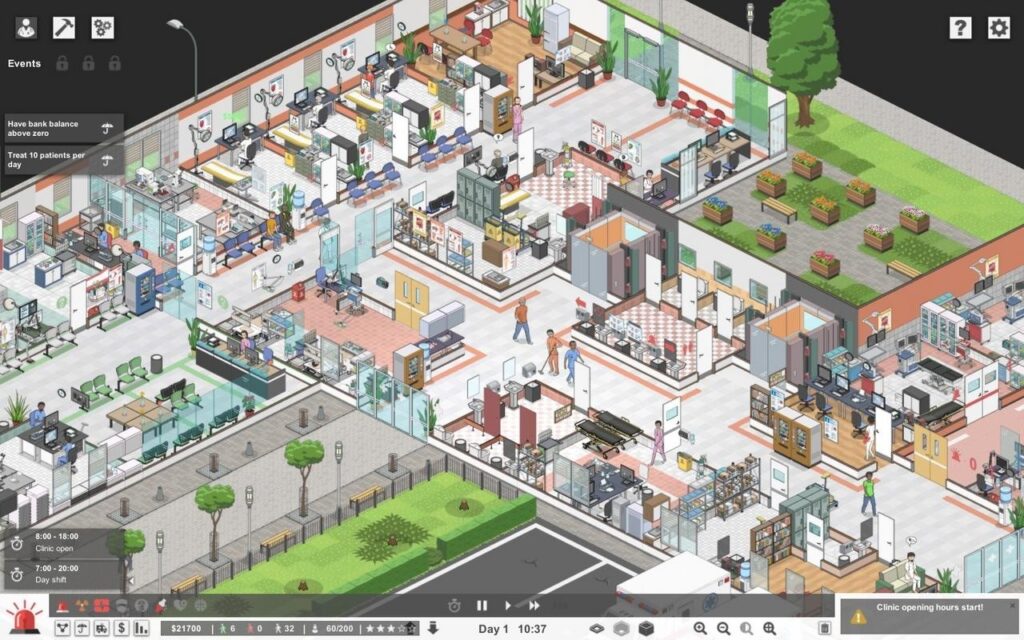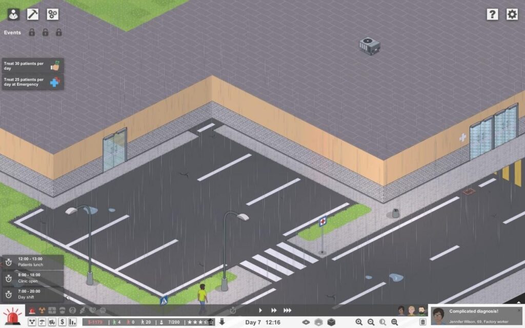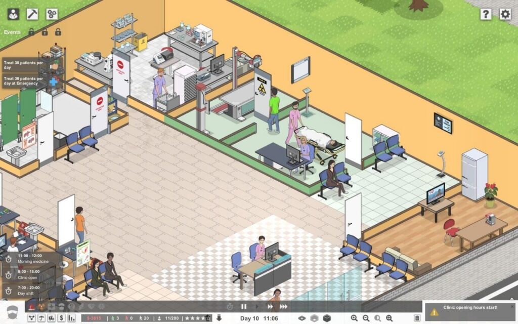На момент релиза основная недоработка геймплея это его низкая интерактивность. Достаточно построить пару-тройку кабинетов терапевтов и туалет, после чего больница начнёт жить своей жизнью и просто приносить доход. Никаких действий от игрока после этого не требуется, кроме как накопить денег и построить новое отделение, после чего опять накопить денег и построить ещё одно, и так по кругу. Не хватает каких-то событий, которые заставили бы игрока встряхнуться, что-то поменять и что-то решить – всё идёт ровно, гладко и как по рельсам, что может наскучить спустя какое-то время.
