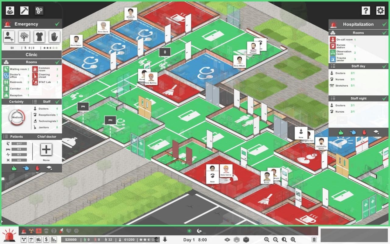 К счастью, в Project Hospital существуют шаблоны кабинетов, которые можно построить одним кликом с автоматическим зонированием. Зонирование играет важную роль в Project Hospital: для каждого отделения необходимо расчертить отдельные зоны и каждое отделение должно включать необходимый минимум зон помещений. Например, хирургия обязательно должна включать операционную. Зоны разделяют различные отделения больницы друг от друга, что необходимо для таких геймплейных возможностей, как назначение врача или пациента в конкретное отделение. В режиме зонирования также определяется, соответствует ли кабинет необходимому минимуму требований – входная дверь, нужное оборудование и приписанный сотрудник. К сожалению, при несоответствии требования к оборудованию не показывается то, чего именно не хватает, и это не всегда очевидно: например, достаточно сложно догадаться до того, что именно прозрачная дверь в туалетной кабинке не даёт игре воспринять туалет как завершённое помещение, поскольку это нигде не написано.