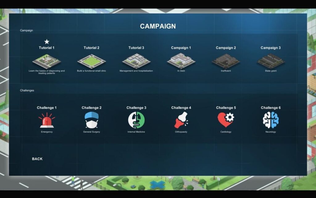 В Project Hospital есть 2 режима: кампания и песочница. Кампания разделена на обучение, классическую кампанию и сценарии-испытания. Испытания отличаются от классических заданий кампании своей направленностью – например, в течение 10-ти дней вылечить 90% пациентов при условии, что каждый день будет приходить на 5 пациентов больше и тому подобное.