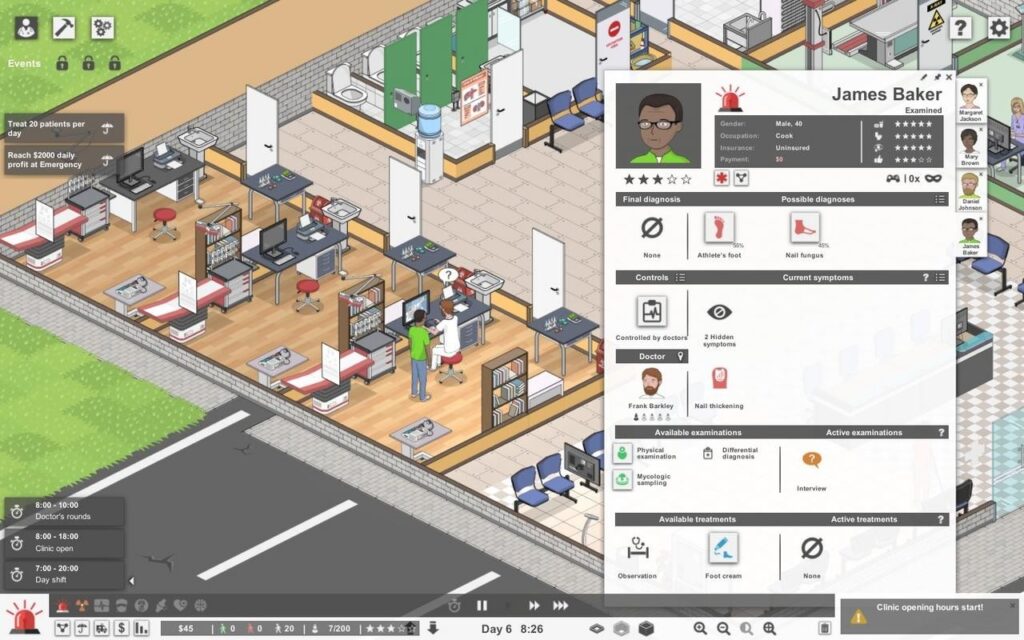 Система заболеваний в Project Hospital выглядит довольно продвинутой. Пациенты приходят в клинику с симптомами, которые отображаются в их карточке. Некоторые из них явные, а некоторые – скрытые, и чтобы их обнаружить, необходимы различные обследования: от простого расспроса терапевтом до рентгена и сдачи анализов. Чтобы поставить диагноз с точностью 100%, необходимо раскрыть все симптомы пациента.