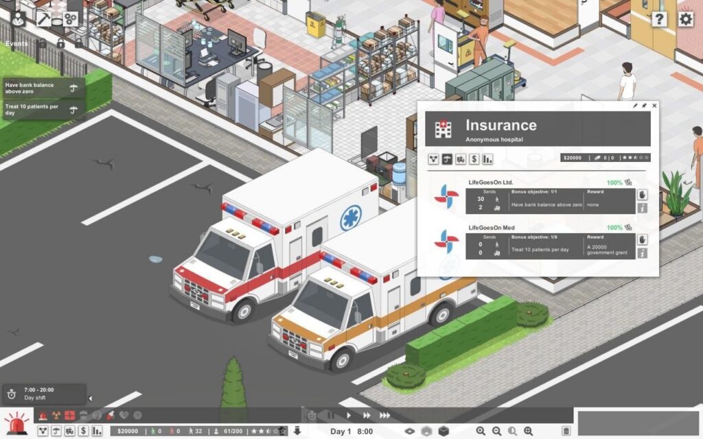 Страховые компании являются источниками целей в игре. Отстраивая свою больницу, вы сможете подписать контракты со страховыми компаниями, которые будут давать вам дополнительных пациентов и при этом ставить разнообразные задачи. Например, построить то или иное отделение или вылечить 20 пациентов в день. По мере выполнения этих целей вы будете получать денежные вознаграждения и доступ к новым, ранее недоступным отделениям. Вся эта система довольно сильно напоминает систему грантов в стратегии о тюрьме Prison Architect.