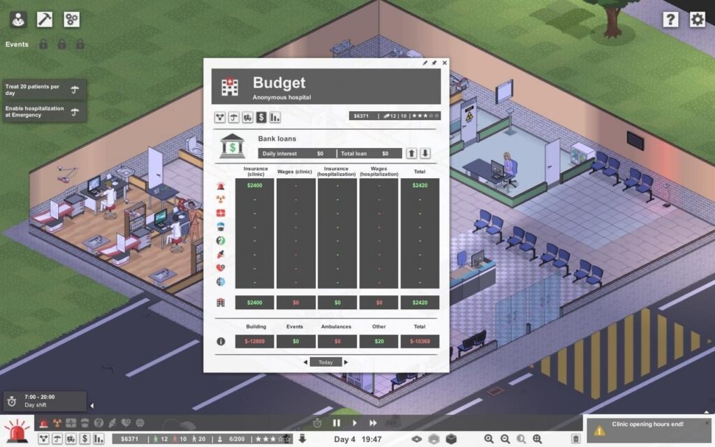 Экономическая система в Project Hospital, к сожалению, довольна проста. Здесь есть обычная строка доходов, которые игрок получает за каждого излеченного пациента в клинике или в стационаре, строка расходов, состоящая из зарплат персоналу, и на этом всё. Настраивать цены подобно Two Point Hospital здесь нельзя.