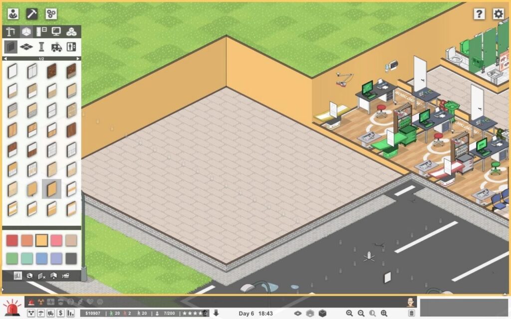 В Project Hospital достаточно гибкая, но при этом не очень удобная система строительства. Здесь есть множество различных вещей, типов стен, целая куча разнообразного оборудования и многое, многое другое. Однако организовано это всё не достаточно удобным образом: для того, чтобы построить тот или иной кабинет, необходимо сначала начертить его зону в режиме зонирования, потом построить ему стены в режиме строительства и лишь потом нажать на саму зону, чтобы игра показала, какие предметы необходимы для его функционирования и обставить ими кабинет.