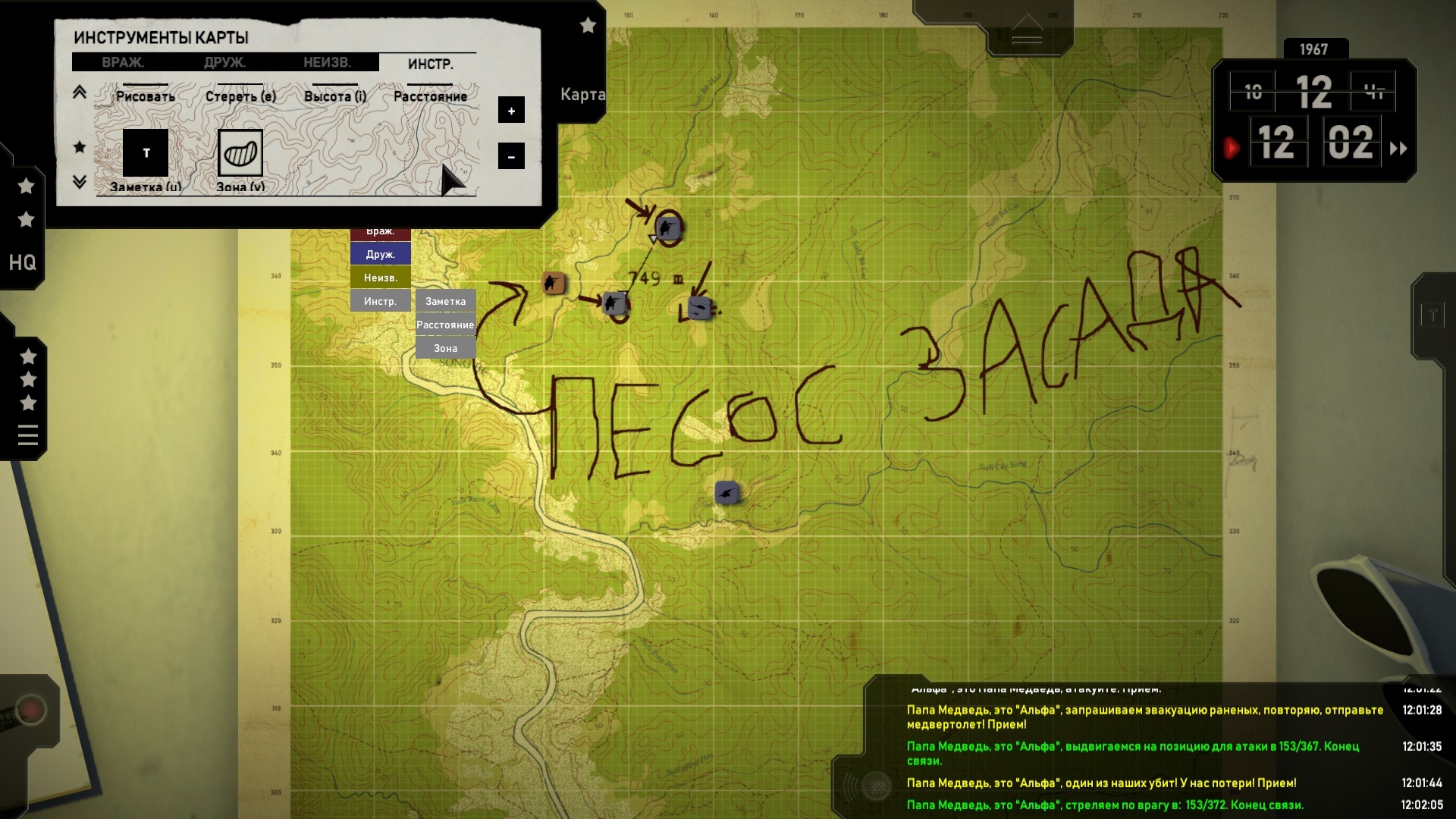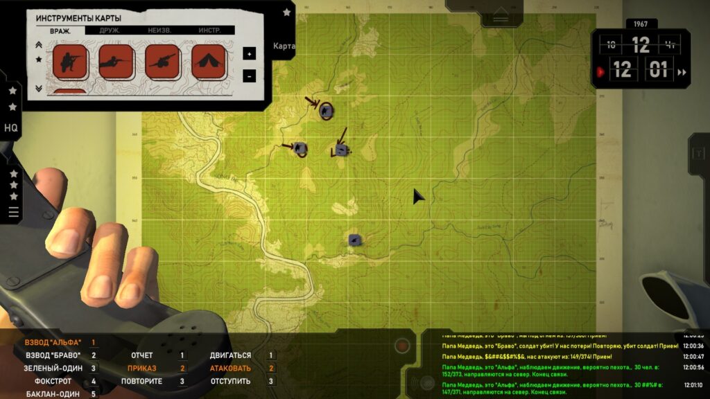 Перед вами план местности, по которому вы вольны двигать фишки как душе угодно, это всё равно ни на что не влияет. А вот что влияет, так это приказы отдаваемые по радио, как на скриншоте ниже.