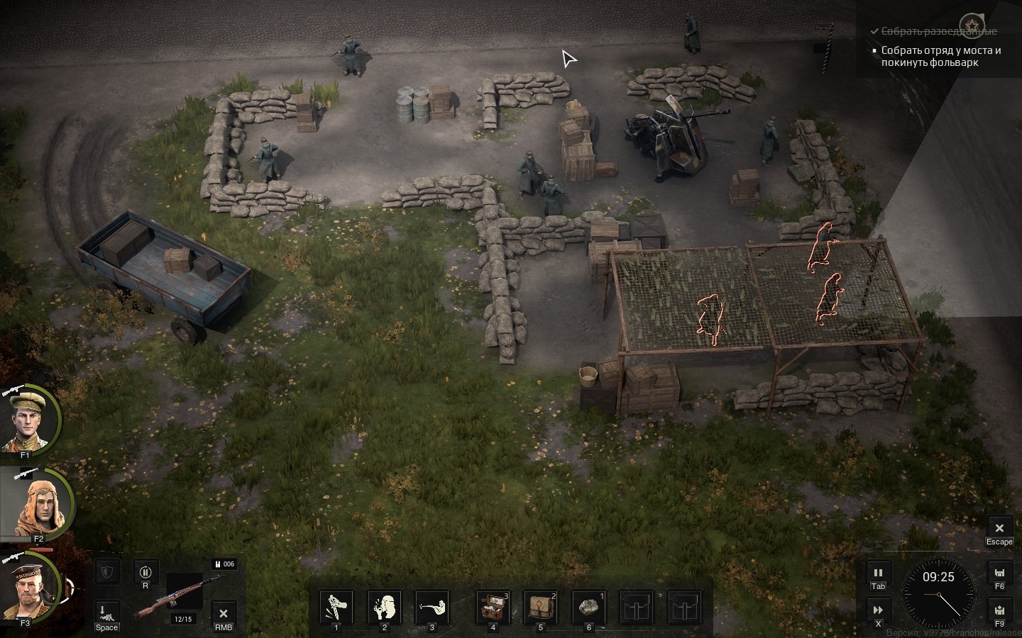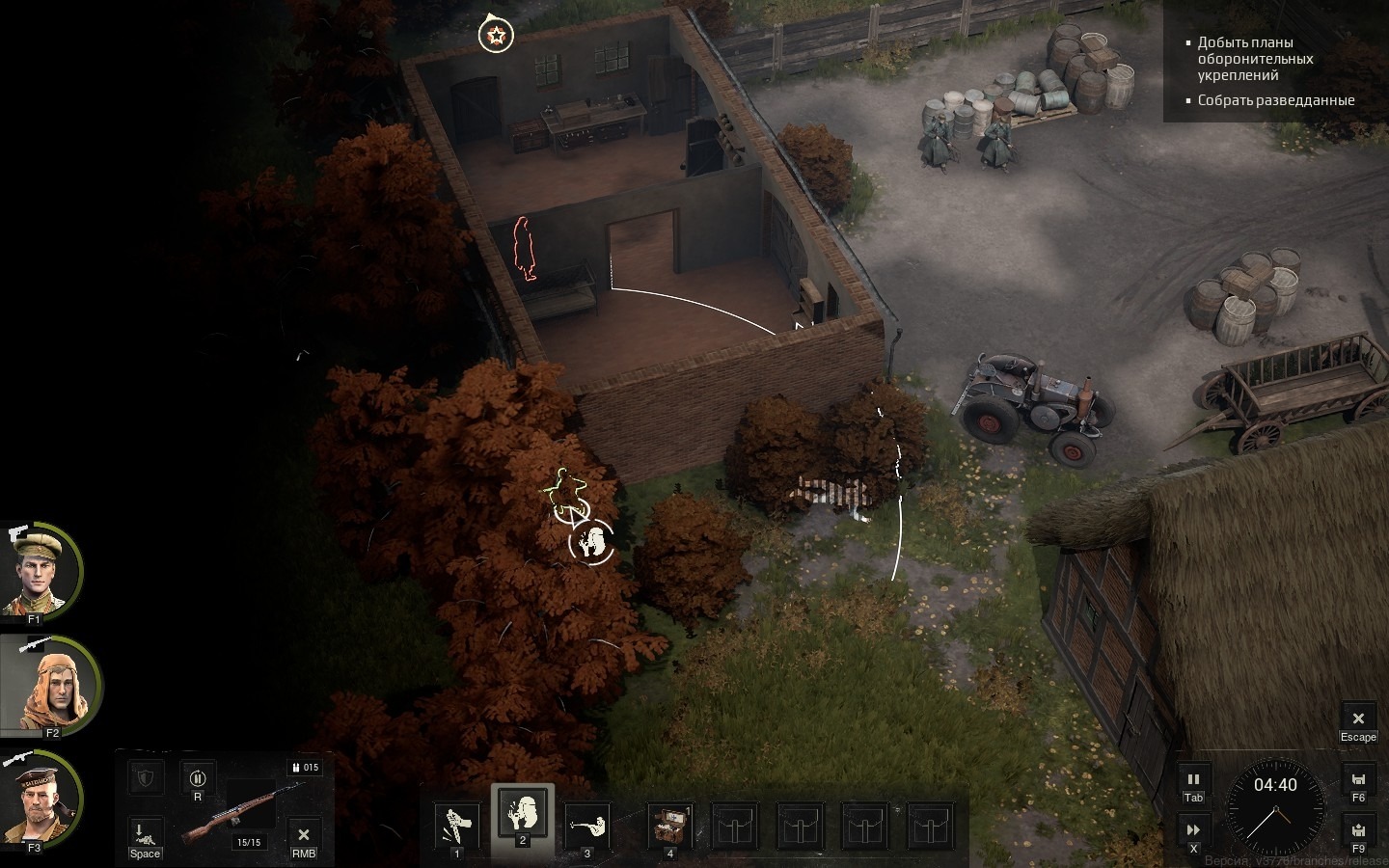 Кусты сохраняют свою роль основного укрытия, но лишились соответствующего индикатора, показывающего, что в данном месте персонаж будет скрыт. Поскольку я смотрел на персонажей преимущественно сверху, то периодически считал, что мой разведчик укрыт, сидит в кустах, в то время как с точки зрения игры он выходил из кустов на обозрение немецкого патруля.