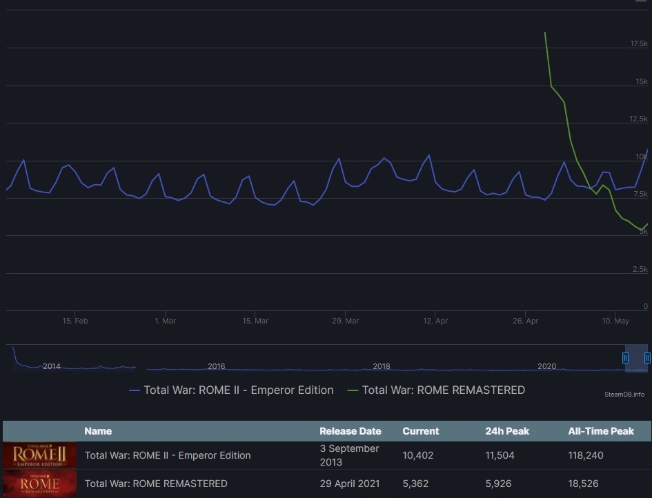 Total War: ROME REMASTERED вышла 29 апреля и вызвала ажиотаж среди любителей классических игр серии Total War. Согласно данным статистического сервиса SteamDB, в день релиза онлайн переиздания ожидаемо превысил онлайн сиквела – тогда в REMASTERED играли почти 18,000 игроков, а в Rome II – всего 7,000. Однако такая разница продлилась недолго.
