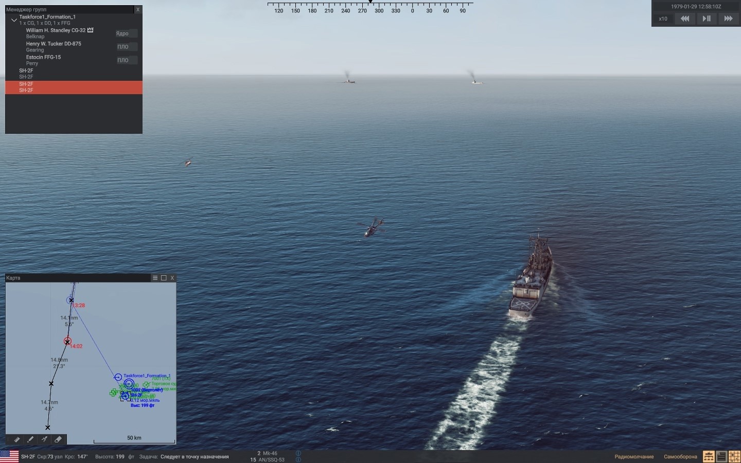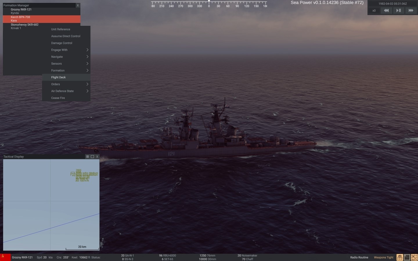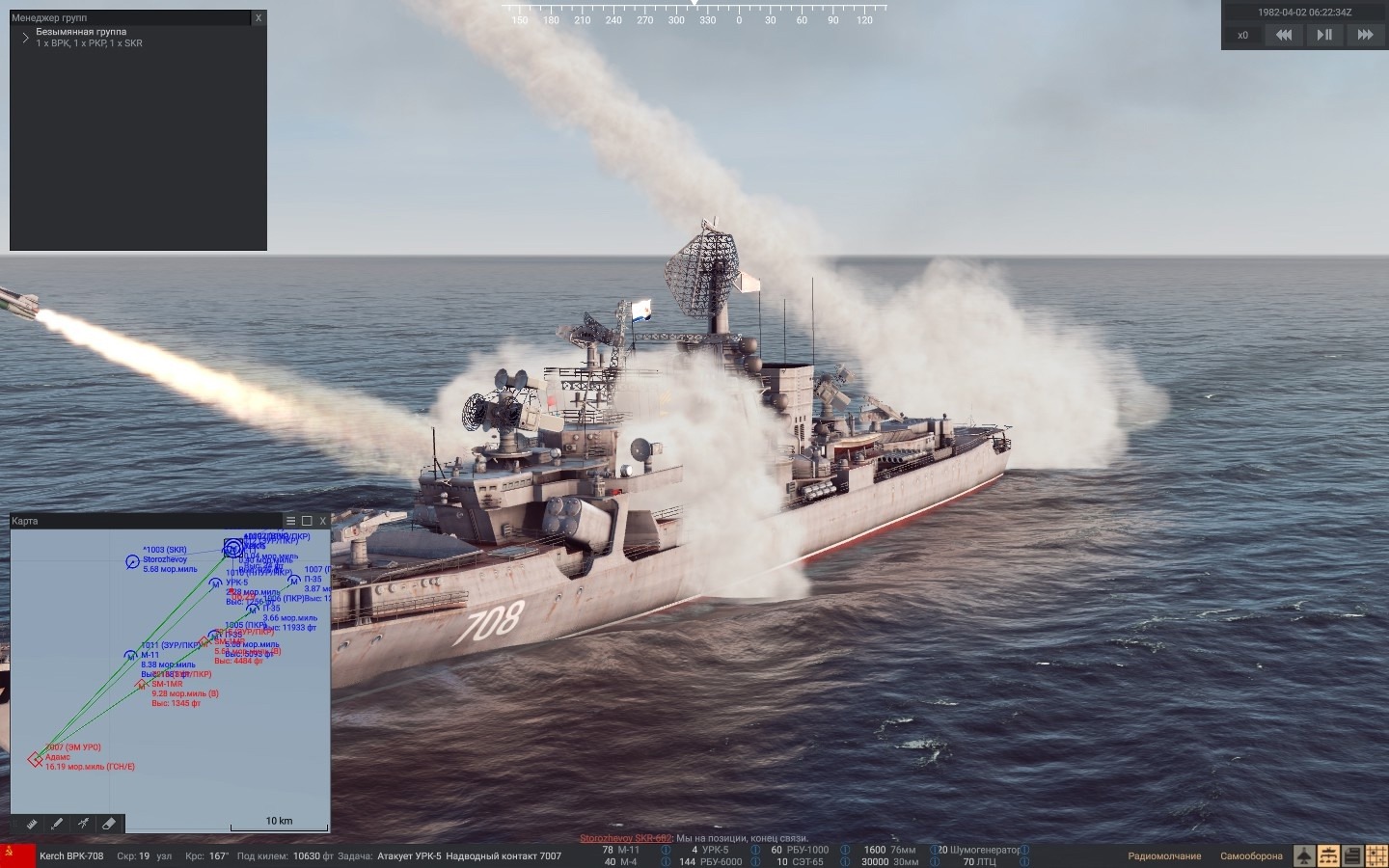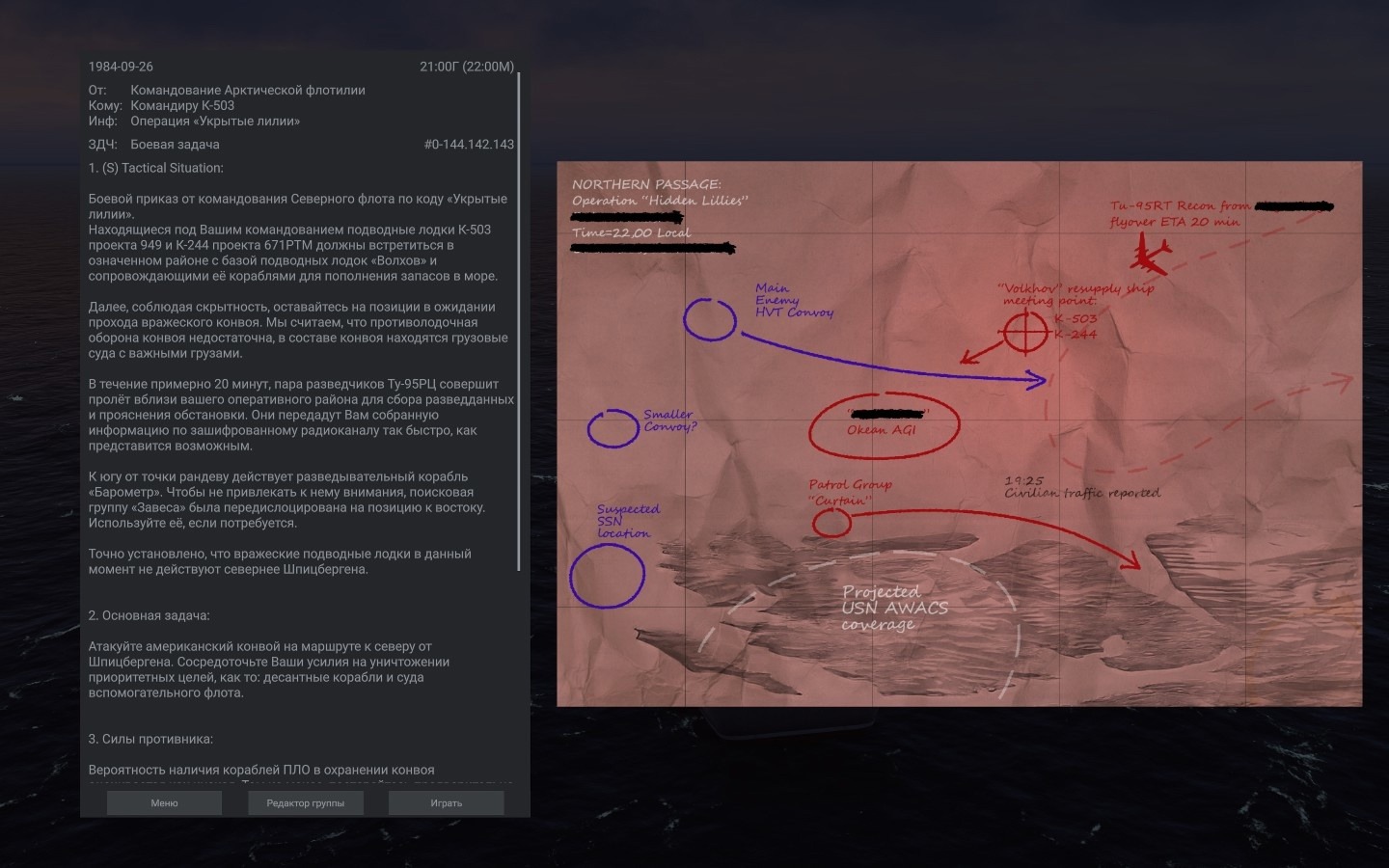 Случай, который изначально стал неприятным звоночком об интерфейсе — в миссии об охоте на эскортируемый конвой НАТО (Важная цель) игроку выдают советский большой противолодочный корабль как флагман группы, на борту которого имеется вертолёт. При брифинге вам предлагают использовать его как разведчика, чтобы обнаруживать и идентифицировать цели. Задача поиска конвоя осложняется необходимостью отделять агнцев от козлищ, то есть корабли конвоя от просто мирных судов, плавающих в той же акватории. Я долго не мог понять, почему диалоговое окно для подготовки к вылету палубной авиации (в данном случае, единственного вертолёта) появляется при нажатии на соответствующую кнопку через раз. Баг это, как водится в раннем доступе, или фича? Причём игрока даже не оповещают, есть ли этому какие-то объективные причины вроде манёвра корабля или погодных условий, и чисто визуально море в данной миссии было спокойно, а суда следовали по прямой. Только потом, на третьем-четвёртом перепрохождении я понял, что одним кликом мыши по соответствующему кораблю в списке формаций я его только выделил, но не выбрал… В то же время, правым кликом вызывается контекстное меню, из которого можно вызывать авиацию, соответствующая кнопка там есть, она доступна для клика. Вот только, с учётом того, что корабль фактически не выбран, нажатие на эту кнопку ничего не делает, а понять это можно лишь по подписи внизу экрана, что в горячке боя не слишком удобно.