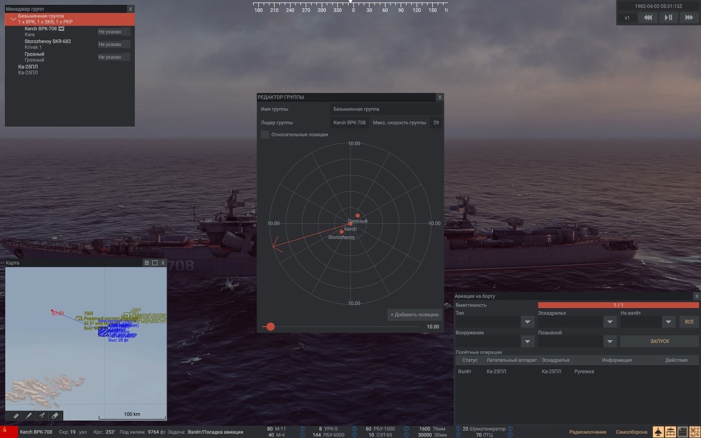 Помимо раздачи указаний отдельным кораблям, можно работать и с полноценными соединениями. В редакторе групп на данный момент можно задать относительное положение кораблей группы друг относительно друга и максимальную скорость, режим работы в радиоэфире и использования вооружения.