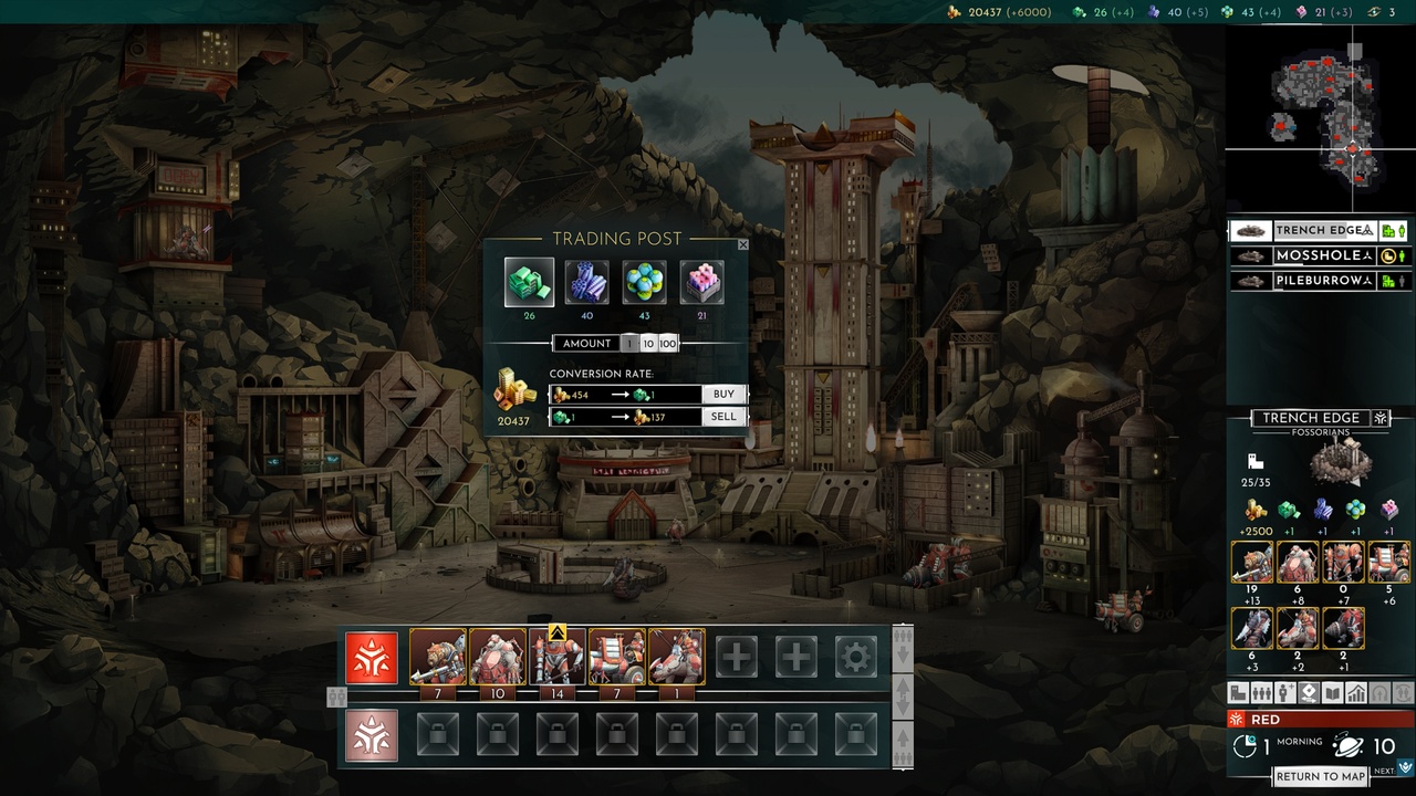 Главный элемент базы – это здания, которые игроки смогут строить за ресурсы. Среди них экономические постройки, постройки для найма юнитов, защиты базы и другие. Каждый цикл на базах будет появляться определённое количество юнитов, доступных для найма. Находясь в гарнизоне, они смогут защищать базу, однако покинуть её смогут только при наличии командира. Также, игрок сможет обменивать ресурсы, построив торговый пост – правда, не всегда по выгодному курсу.