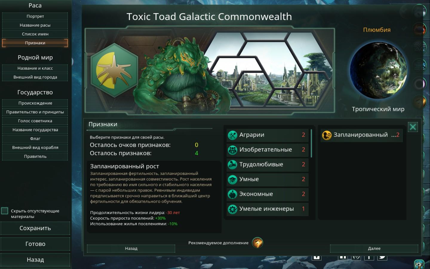 Одну из своих главных особенностей Stellaris демонстрирует ещё до начала игры. Это – продвинутый редактор рас. В отличие от многих других космостратегий, которые предлагают игрокам выбрать один из десятка уже готовых видов людей и инопланетян, Stellaris предлагает создать своих, полностью уникальных существ. Агрессивные токсичные жабы, гномы-пацифисты, морские креветки, ударившиеся в науку, разумные грибы, занимающиеся генетическими исследованиями или деревья, которые обрели коллективный разум… Это лишь несколько из сотен доступных комбинаций.