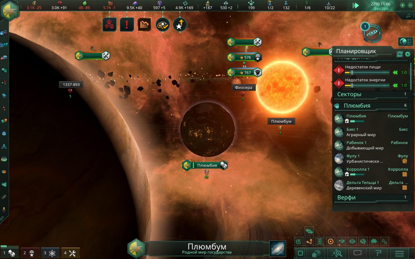 Разработчики множество раз переделывали эту систему и наконец получили то, что имеем сейчас: строительство «домиков» было значительно уменьшено, а население стало независимым и теперь само выбирает, в каких «домиках» работать. Каждую планету также можно отдать под руководство ИИ и даже создать независимый сектор, который будет управляться тем или иным образом.