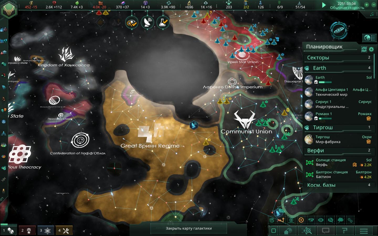 Перейдём к сути игры: что же нужно делать в Stellaris? В общем и целом, вы становитесь правителем цивилизации, только что открывшей возможность сверхсветового перелёта между звёздами, и отправляетесь на покорение космоса. Игра начинается с одной планеты, исследовательского и строительного корабля. На планете можно строить добывающие здания, которые дают населению возможность производить те или иные ресурсы. Исследовательское судно отправляется на изучение близлежащих солнечных систем, а строительный корабль – на постройку добывающих ресурсы станций в космосе.