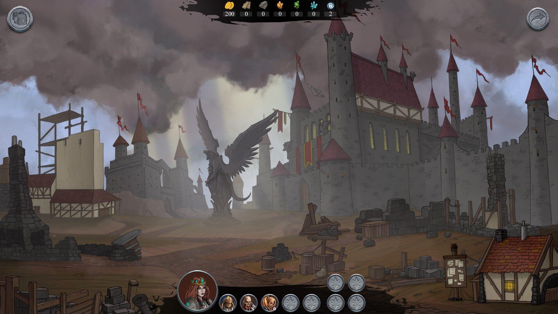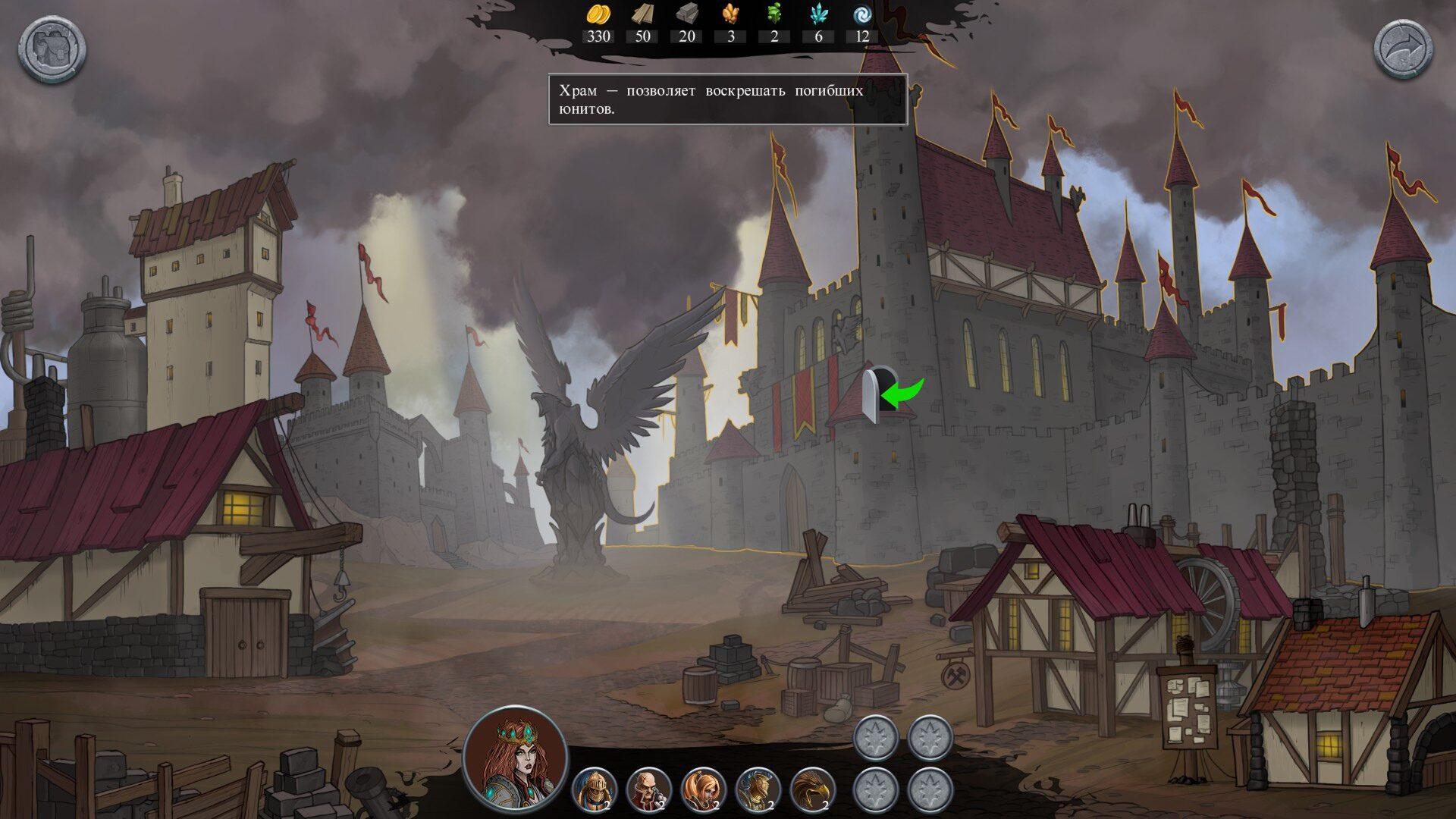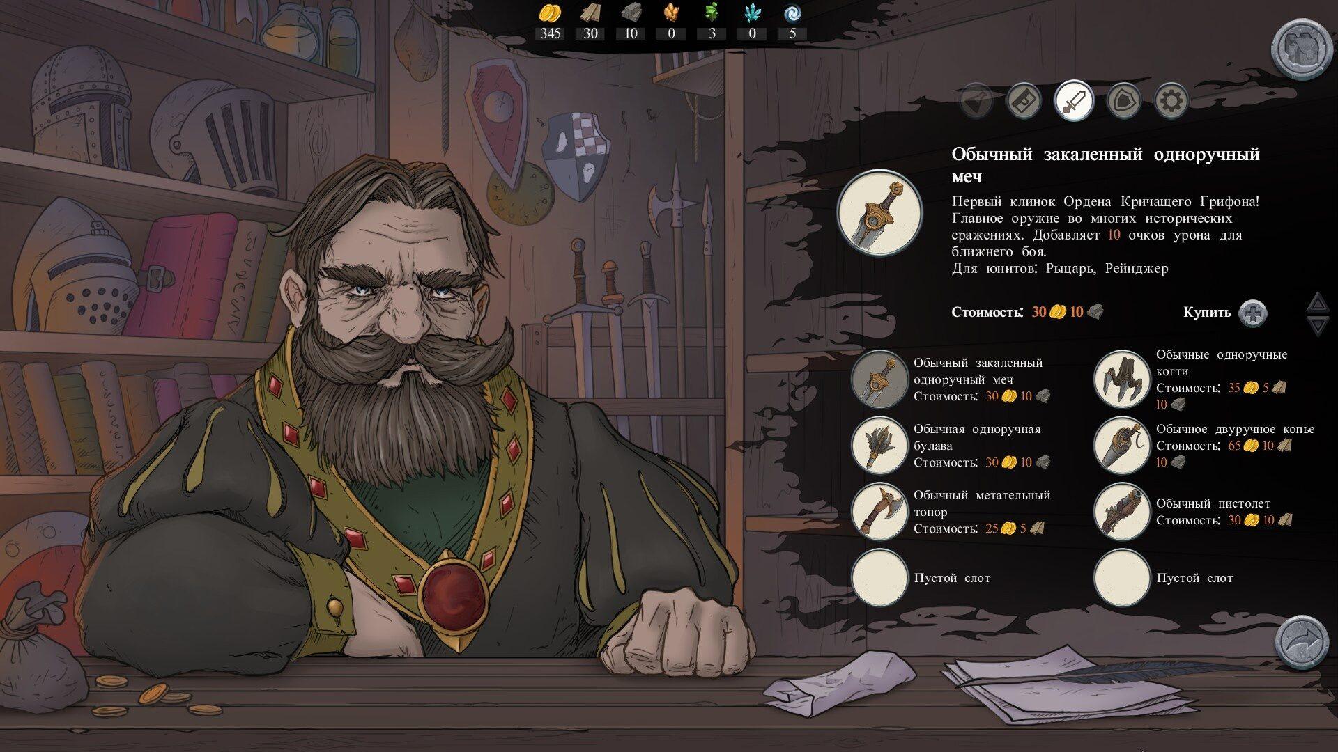 В замке можно построить лавку алхимика и кузницу, чтобы экипировать вашу армию и ещё пару зданий, чтобы нанимать и воскрешать воинов, а также обменивать ресурсы. В лавке алхимика продаются расходники-зелья. Эффекты зелий разнятся от спасительных (получить иммунитет от физических атак на 1 раунд), до практически бесполезных (восстановить 50 очков здоровья, когда атака наносит под 100 и больше). Чтобы испить зелье, придётся пожертвовать очком действия, поэтому надо десять раз подумать, стоит ли вообще пить, когда можно… бить! В кузнице продают оборудование на повышение атаки, защиты, здоровья и прочих атрибутов. Вариативность предметов оставляет желать лучшего. На каждый слот найдётся всего одна подходящая вещь, в боях новые предметы не выпадают, за исключением зелий. На мой взгляд, пусть лучше бы было поменьше слотов у каждого персонажа, но побольше вариативность предметов, больше лута!