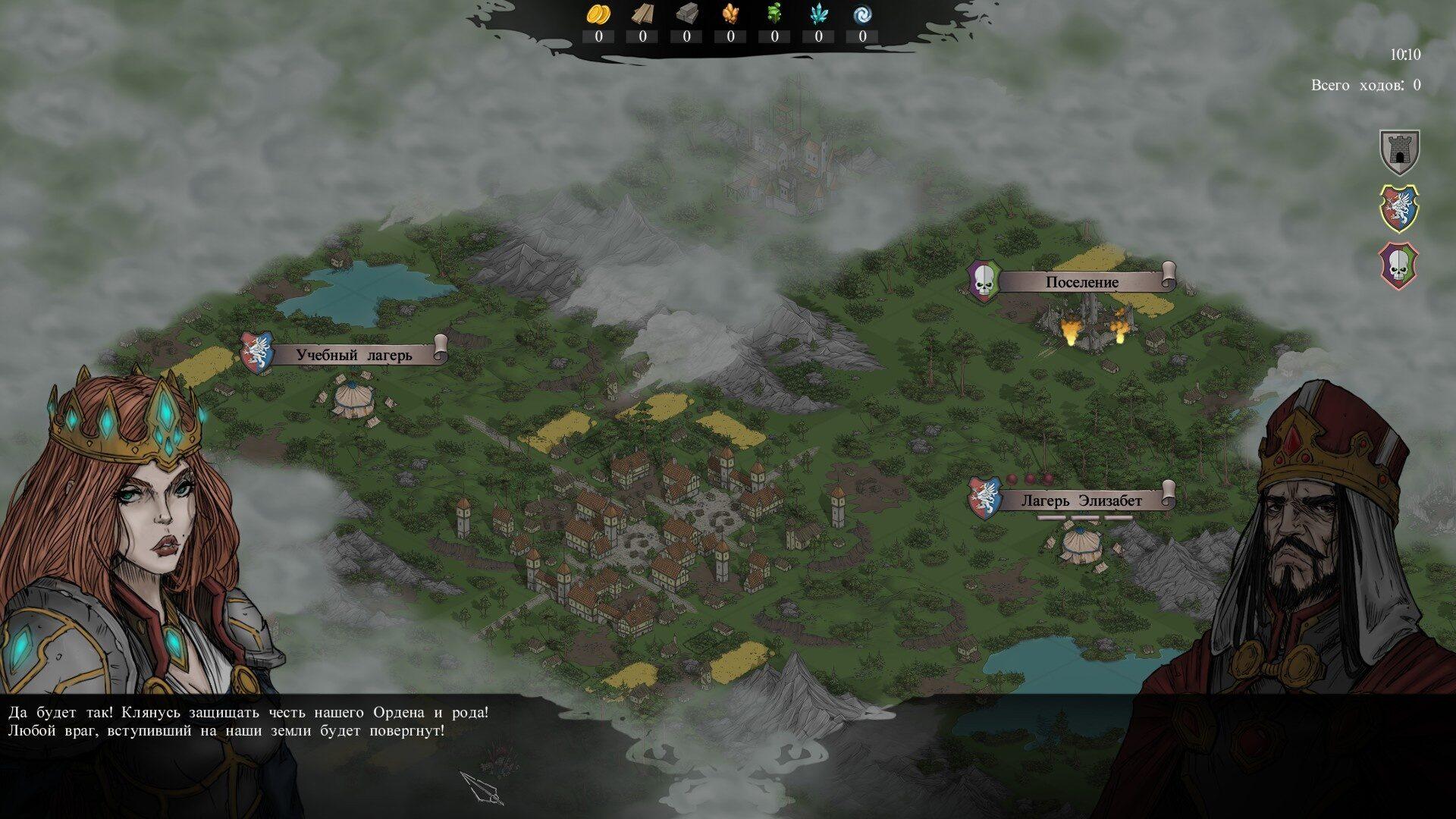 После запуска игра встречает меня как открытая книга, причём буквально. Главное меню стилизовано под книжицу с закладками-пунктами меню. Однако, ни сами пункты, игры ни стартовый игровой экран не имеют никаких надписей. Согласен, незачем напоминать по десять раз игроку, как называется игра, он ведь только что её запустил и прекрасно знает! Сразу открываю настройки, в них всё стандартно: аудио, язык, разрешение экрана. Есть горячие клавиши — это плюс. Правда перенастроить их нельзя — это минус. Самый важный пункт в опциях — это «Фразы юнитов». Я рекомендую сразу отключить фразы, но смеха ради можете и оставить их, чтобы словить испанский стыд от потуг озвучки пафосных фразочек в стиле «Хладнокровие и точность!», которые кстати то английские, то русские.