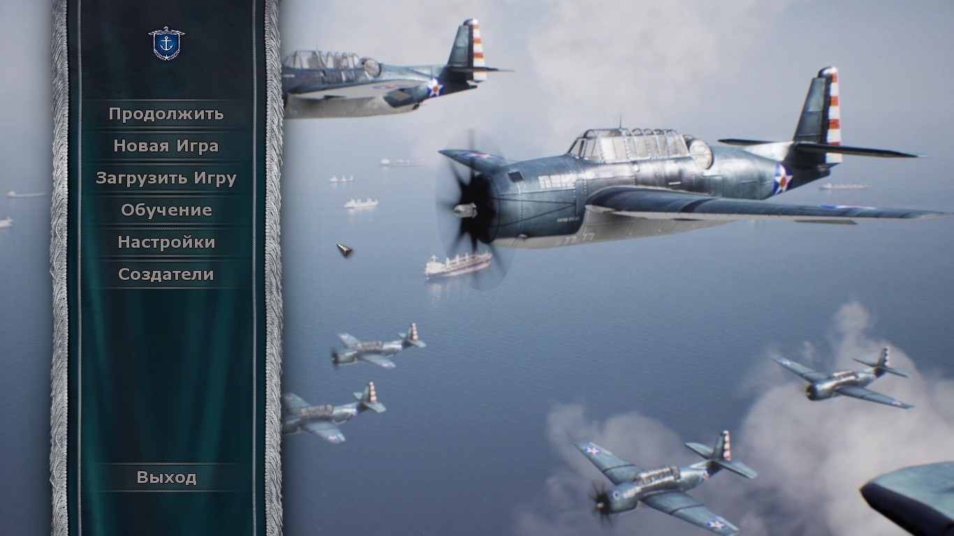 Главное меню игры загружается без каких-либо предварительных вставок. Что тут сказать? В целом, меню сделано на совесть. Никакой клоунады со шрифтами: строгая планка с выбором новой игры, обучения и сохранений. Справа – зацикленная анимация. Идут ровным строем эскадры, летят вполне себе узнаваемые «Зеро», развеваются знамёна, стреляют частыми залпами линейные корабли, а на прибрежных холмах застыли в ожидании танки с восходящим солнцем на башнях. Мелочь, но приятно, настраивает на нужный лад.