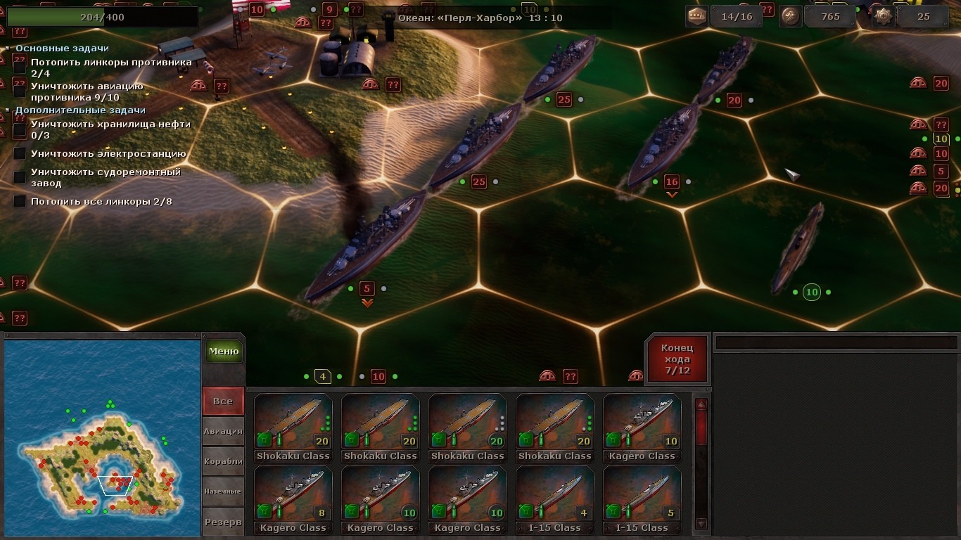 Определённо, обучение было совсем не лишним. Теперь, зная милые особенности зенитной артиллерии, я постарался нанести максимальный урон в первые два хода, пока янки не успели проснуться. Большая часть основных целей выполнена – шесть из восьми линкоров на дне. Американские истребители и бомберы догорают на аэродромах, а гавань затянута жирным шлейфом черного дыма от догорающего топливохранилища. Мне удалось?