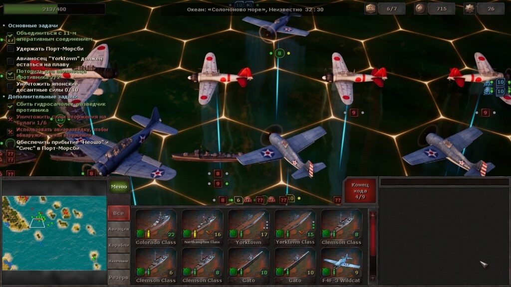 Управление тоже не самое удачное. Хотя, казалось бы: щёлкни мышью и отправь самолет бомбить врага/бросать торпеды. Если просто выбрать самолет и промахнуться мимо цели – беда. Боевая единица пройдёт ровно столько, сколько было указано, даже если это всего лишь соседняя клетка с аэродромом. Ни больше, ни меньше, и в итоге ход будет потерян. Поэтому поднимая в воздух какой-нибудь «Доунтлесс» лучше щёлкнуть на иконку «взлет» и только затем выслать штурмовик к цели. Но и с целями тоже беда… Штука в том, что те же торпедоносцы могут сбрасывать свой груз на соседних с целью клетках. И это, в общем-то, логично. Игра же почему-то рекомендует… метать торпеды находясь прямо НАД целью. Из обучения следует, что таким образом можно нанести наибольший урон… В чём же проблема? А в том, что торпеды – это совершенно отдельная, расходуемая экипировка самолета, и обычно торпед всего две. С реальностью это согласуется слабо. И одну торпеду самолет времен Второй Мировой тянул с изрядным скрипом. Шутка ли – стандартная японская торпеда «Тип 91» весила без малого тонну. Это придётся списать на игровую условность. Корень проблемы в том, что если просто нажать на цель, то… торпедоносец атакует и даже нанесет урон, но значительно меньший возможного. Торпеды при этом не будут потрачены. Так что для успешной и удачной атаки нужно: