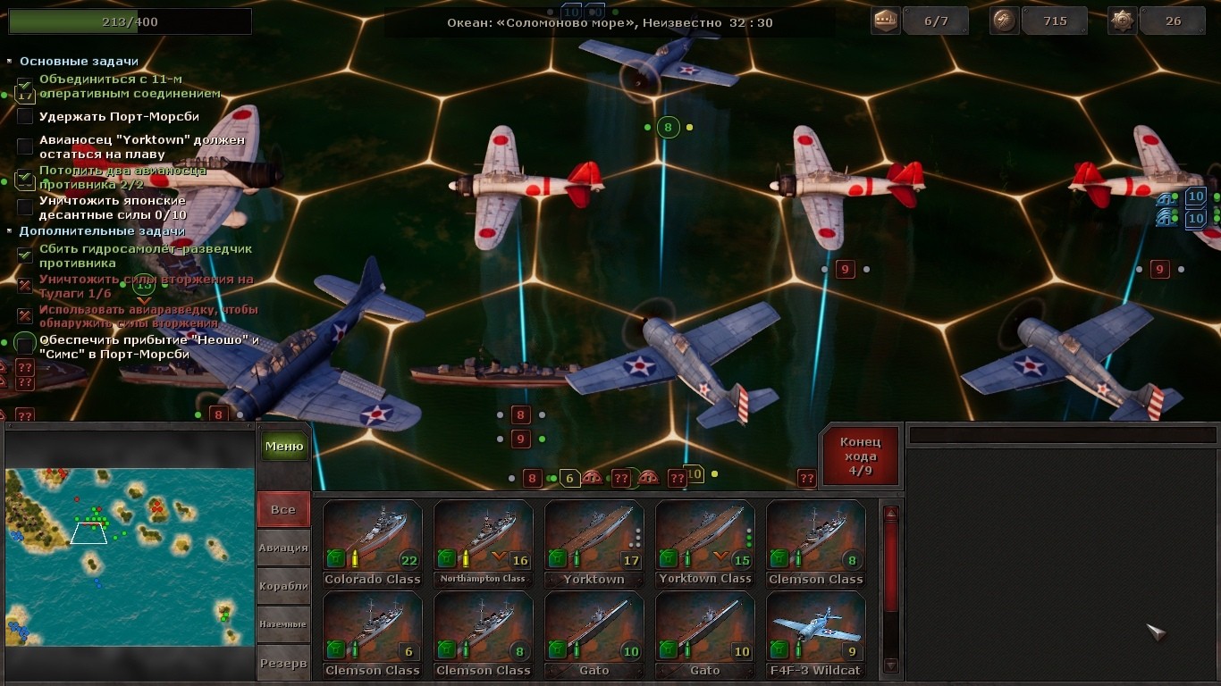 Оказалось, что я не до конца понял местные реалии. Осознание этого простого факта пришло в тот момент, когда я попытался увести на посадку один из торпедоносцев. Он израсходовал все торпеды, да и топлива оставалось едва-едва. Выбрав самолет, ленивым щелчком посылаю его к цели. И тут просыпается наземное ПВО. Да еще как! Эскадрилья торпедоносцев несёт урон. Хуже того, она ещё и теряет очки перемещения, пролетев всего одну клетку! Теперь этот юнит даже атаковать не надо, он сам свалится с небес после нажатия «пропуска хода». Пытаюсь отвести следующий самолет – та же картина, то же самое ПВО. Янки безжалостно «тормозят» мою авиацию на месте, а оставшиеся цели прикрыты плотным «зонтиком». И как же с этим бороться? В смешанных чувствах закрываю миссию. Игра неожиданно сумела удивить, и школа того же Panzer Corps или Order of Battles тут совсем не помогла.