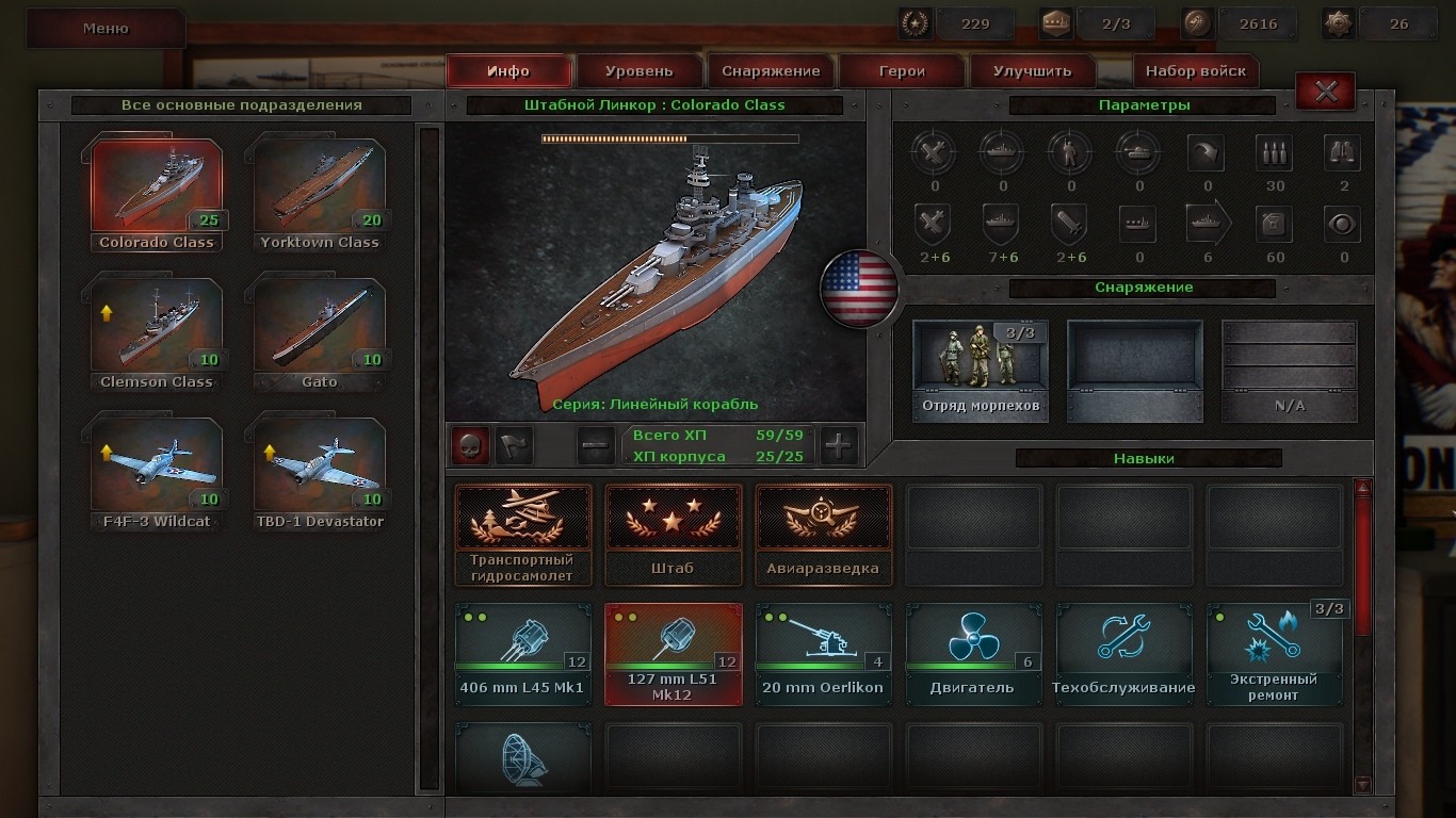 И опять разведка является краеугольным камнем всей миссии. Но не только. Важными элементами успешного завершения любой миссии является ещё и правильная экипировка боевых единиц. И тут на самом деле есть, где развернуться. Начнём с самолетов. Простой истребитель можно оснастить подвесными бомбами. И вот уже ваш «Зеро» или «Wildcat» превращается в импровизированный штурмовик. Теперь уже можно не только прорывать ПВО, но и угостить зенитчиков увесистым подарком. Между миссиями на самолёт можно навесить радар. Весьма полезное приобретение, учитывая факт смены дня и ночи во многих миссиях и ночной штраф к атакам авиации. Не хватает дальности полета? Вперёд, подвесьте на крыльях дополнительные топливные баки. Зажигательные или бронебойные бомбы? А может, нужен фотоаппарат для лучшей разведки? Варианты имеются и не только для авиации. Тот же линейный корабль можно оснастить усиленными бронебойными снарядами, да ещё и погрузить на него бригаду морпехов. Наземные юниты тоже не в обиде. Нужен огнемет или противотанковое оснащение? Есть и они.