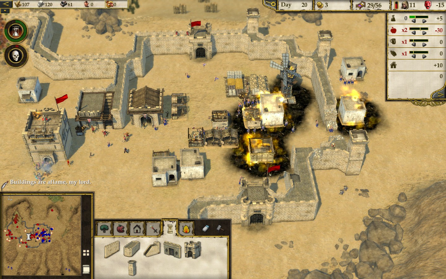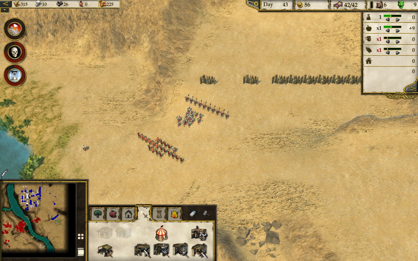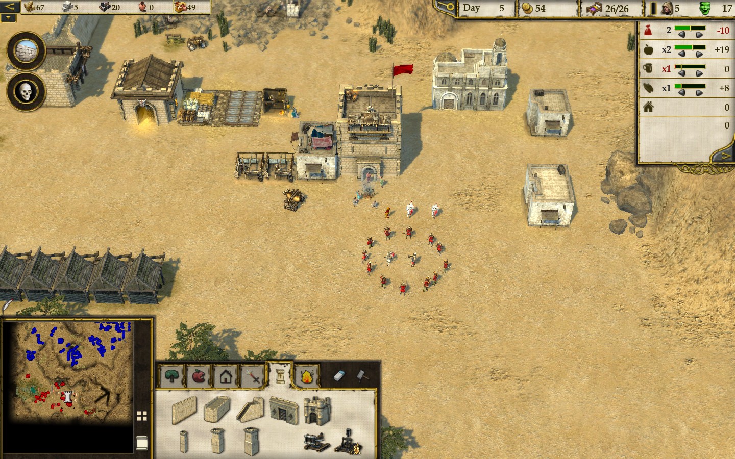 Общая цель экономки Stronghold Crusader 2 – нанять как можно больше солдат, чтобы уничтожить противника. Вообще, эту игру стоит рассматривать как классическую RTS, а не как экономику про строительство замков. Управление поселением мало изменилось с предыдущих частей. Это всё те же фермы, свиньи, сыр, хмель и яблоневые сады, которые крестьяне чудесным образом выращивают в пустыне. Всё это можно производить на ограниченных кусках земли, оазисах, что порождает интересные геймплейные ситуации – например, оазис может находиться за пределами замка, из-за чего его невозможно будет обнести стенами. Ударяя по такому оазису, враг не сломит вашу оборону, но с лёгкостью сломит экономику.