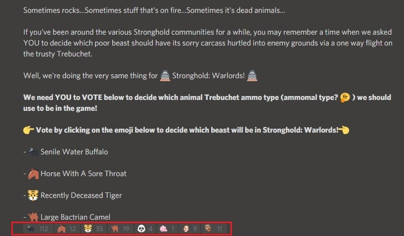 Игрокам с помощью голосования в Discord предстоит выбрать, какому умершему животному посчастливится стать снарядом в новой игре На выбор представлены: водяной буйвол, лошадь с больным горлом, недавно умерший тигр и большой бактрийский верблюд. Проголосовать можно в канале Announcements на официальном сервере Discord, нажав на соответствующий смайл.