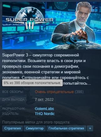 Спустя несколько часов после релиза геополитическая стратегия SuperPower 3 успела получить более трёх сотен отзывов в Steam, из которых всего 6% положительных. Это критически низкий результат, говорящий об ужасном состоянии игры.