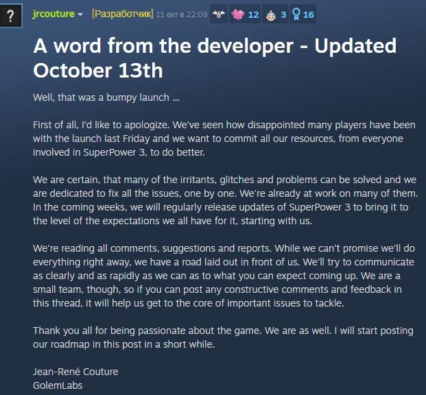 Прежде всего, я хотел бы извиниться. Мы видели, как многие игроки были разочарованы релизом в прошлую пятницу, и мы хотим направить все наши ресурсы от всех участников разработки SuperPower 3, чтобы сделать игру лучше.