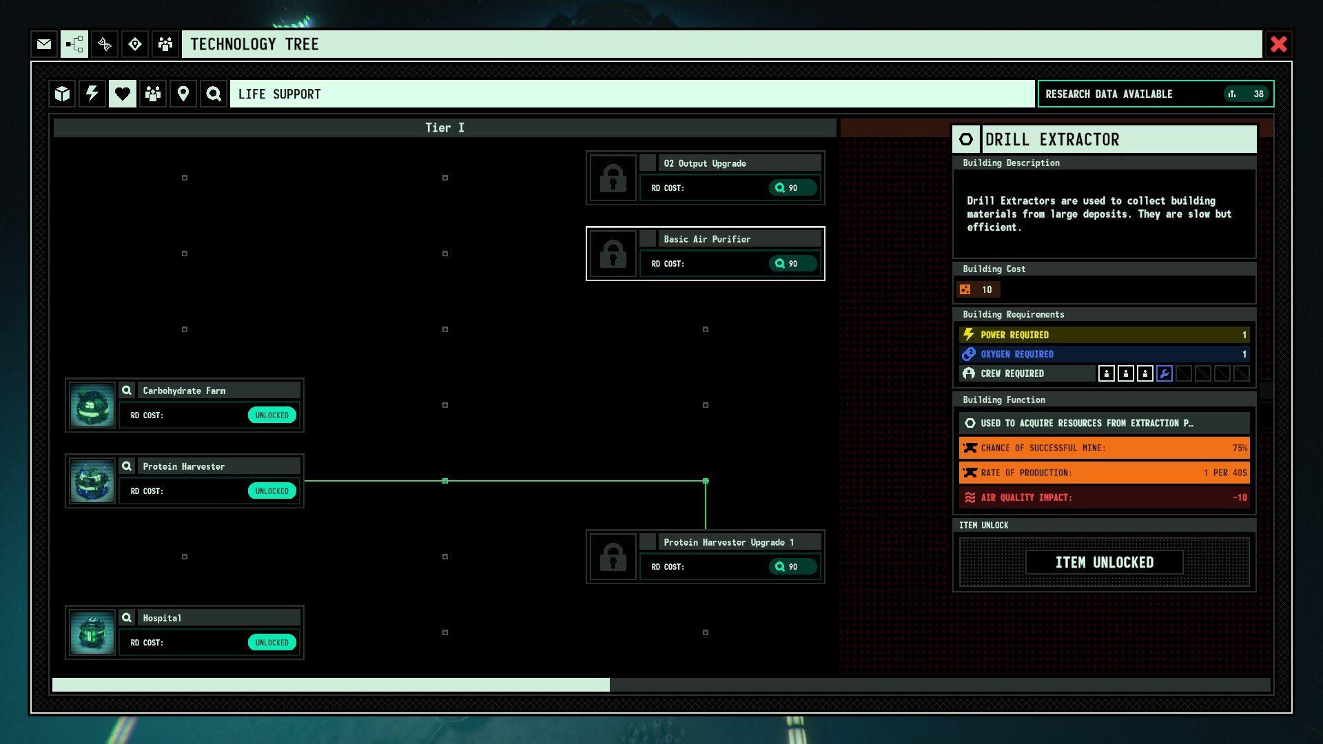Технологическое дерево в игре достаточно короткое и не особо впечатляющее. Большинство исследований связаны с открытием технологии улучшенной добычи какого-либо ресурса, увеличением эффективности работы генераторов кислорода или энергии и прочими количественными параметрами. Прорывных технологий, открывающих новые механики, совсем немного.