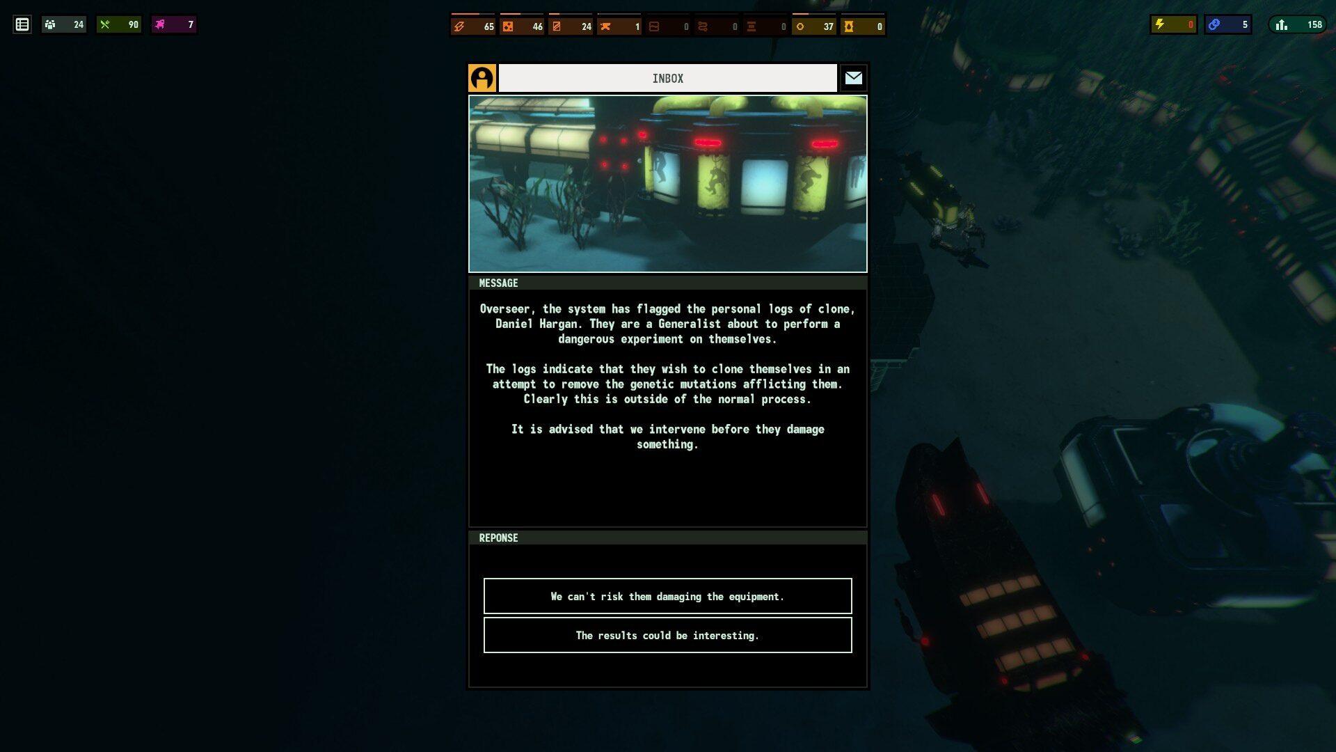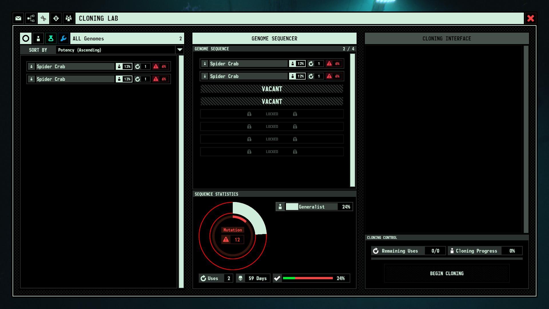 Персонал базы игрока, таким образом, во многом будет состоять из клонов. Впрочем, технология клонирования несовершенна: при комбинировании разных видов генетического материала клоны хотя и могут получить те или иные бонусы, делающие их более эффективными в выполнении ряда задач, тем не менее, обладают очень низкой продолжительностью жизни. Ещё один недостаток представленной в игре технологии клонирования заключается в том, что для создания клонов необходимо извлекать генетический материал из живых существ, истребляя популяции морских обитателей. Восстанавливать численность морских существ призван специальный питомник, но работает он очень медленно и обладает ограниченным радиусом действия. В целом же, комбинировать разные гены для создания населения, отвечающего текущим потребностям, очень интересно.
